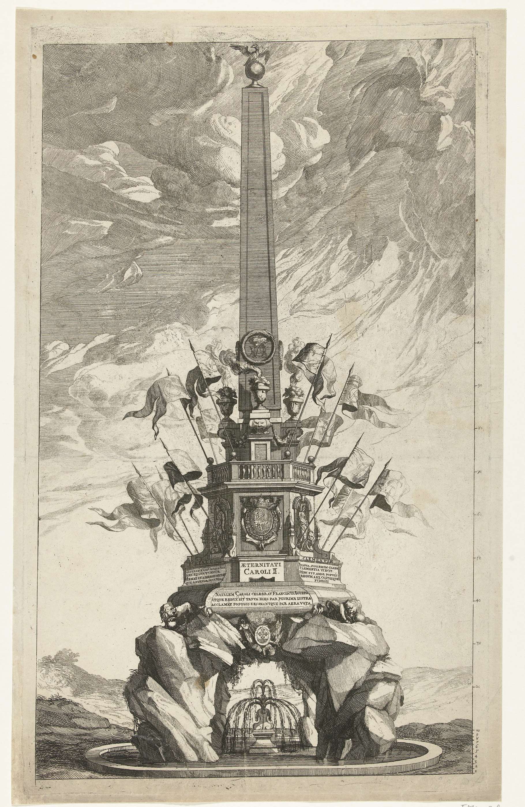 De katafalk in de vorm van een obelisk op een rotsgroep met fontein, opgericht voor de op 1 november 1700 overleden Spaanse koning Karel II. Versierd met vaandels, wapens, allegorische figuren en Latijnse spreuken. Aan de rechterzijde van de kader een schaalaanduiding.