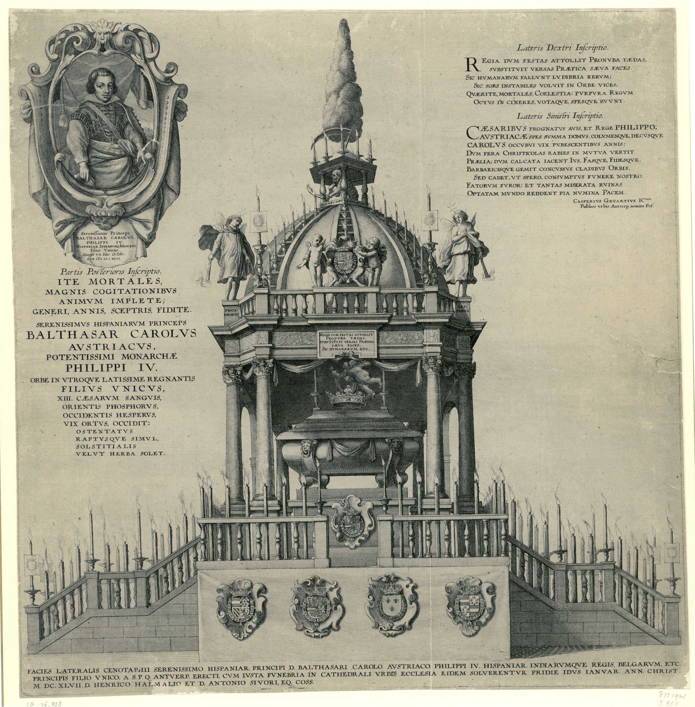 Katafalk op 1 januari 1647 opgericht te Antwerpen ter ere van Balthazar Karel Dominicus Lucas Filips, de in oktober 1646 overleden zoon van koning Filips IV. Deze prent toont het monument van de zijkant. Bovenin de voorstelling twee kolommen tekst in het Latijn en een portret van de prins.