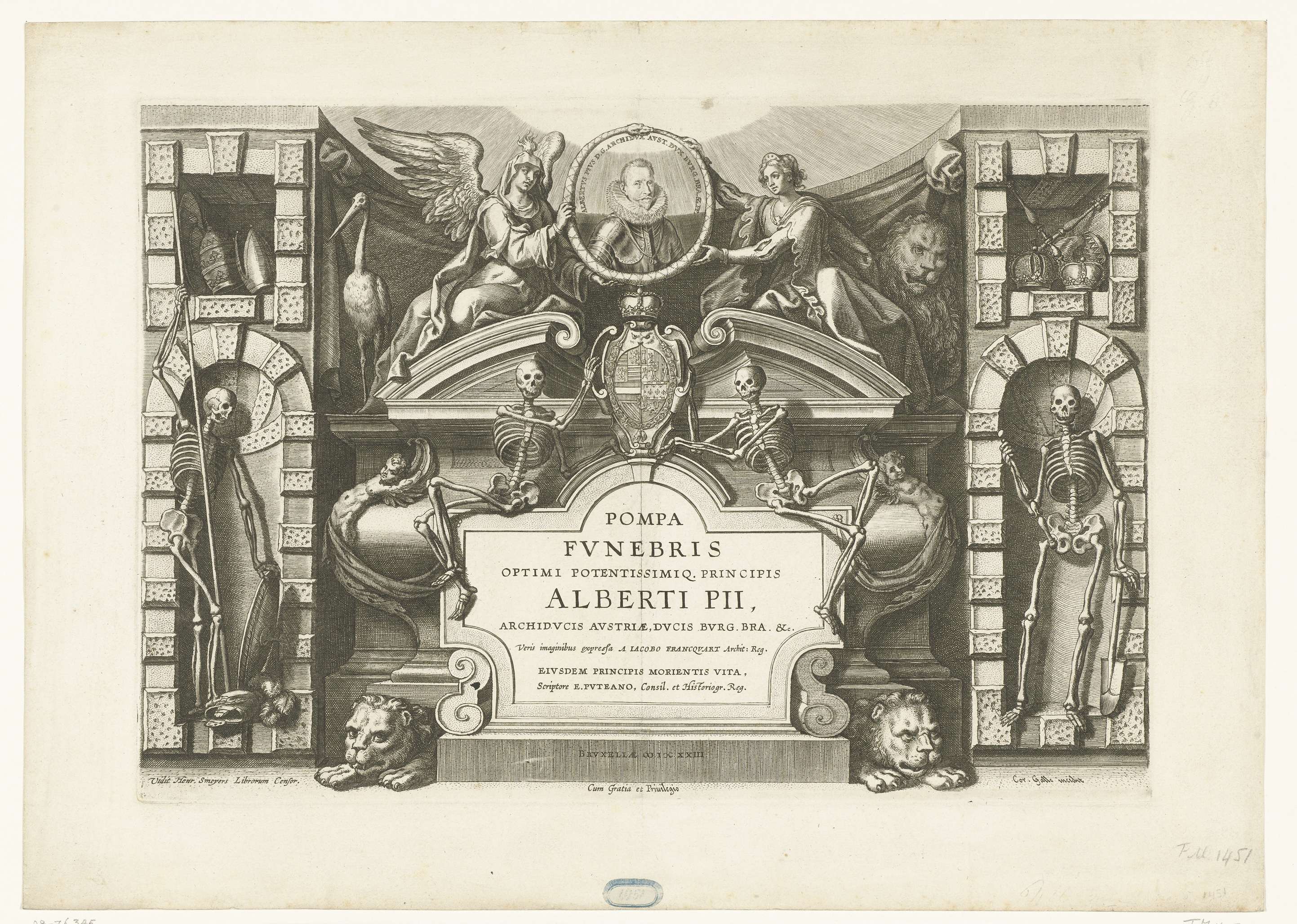 Titelblad voor de prentserie van de begrafenis van aartshertog Albrecht van Oostenrijk, overleden 13 augustus 1621, begraven te Brussel op 12 maart 1622. Tombe in een muur met geraamtes die het wapen van de aartshertog dragen en het portret van Albrecht vastgehouden door de Waakzaamheid en een andere personificatie.