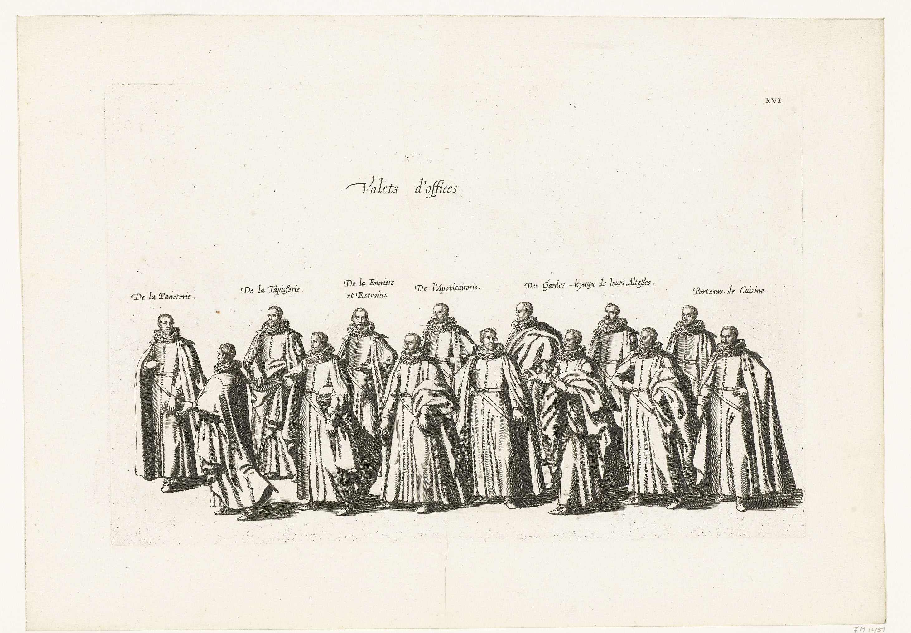 Deelnemers aan de begrafenisstoet. Plaat XVI in de serie van de begrafenis van aartshertog Albrecht van Oostenrijk te Brussel op 12 maart 1622.