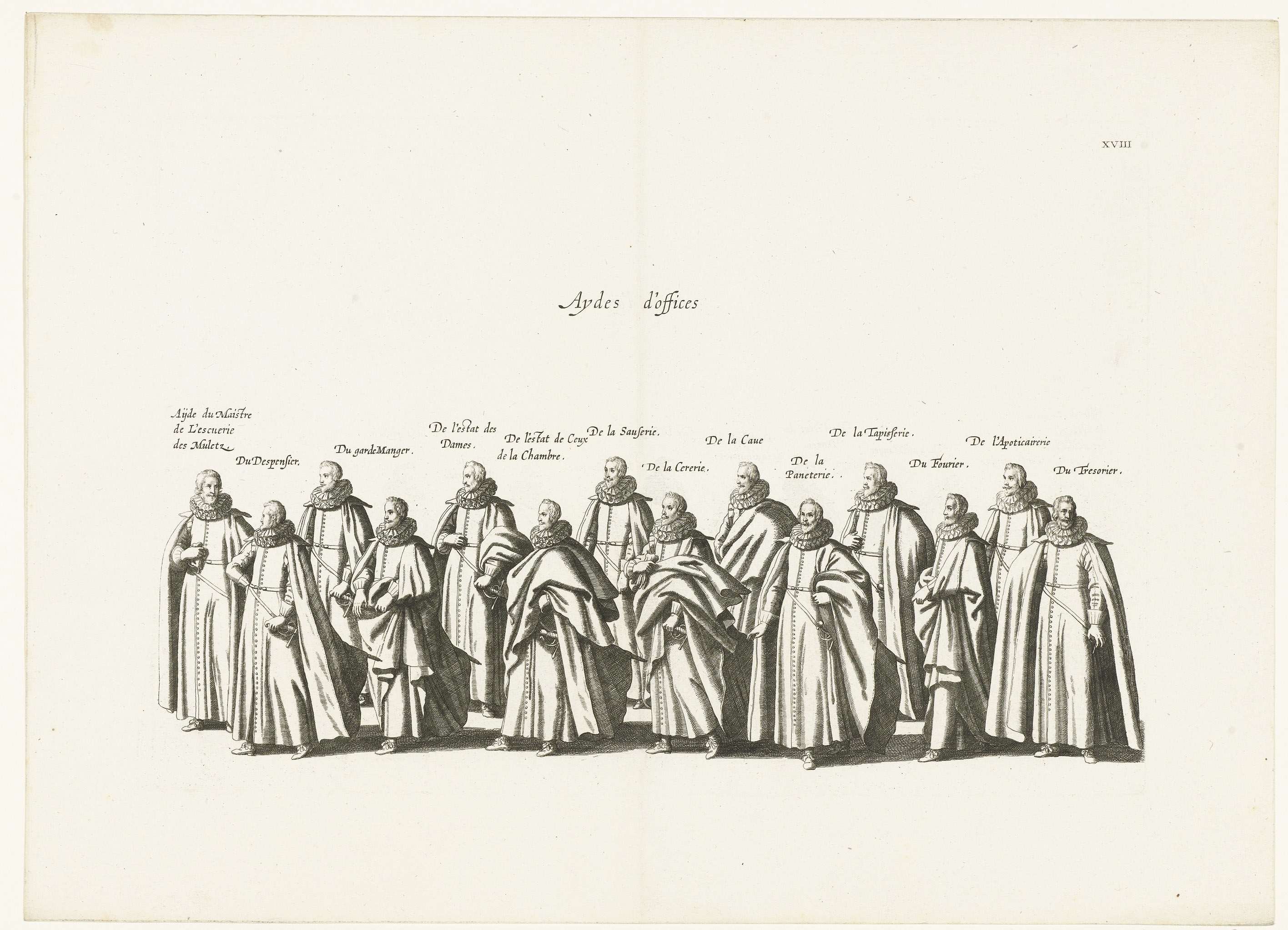 Deelnemers aan de begrafenisstoet. Plaat XVIII in de serie van de begrafenis van aartshertog Albrecht van Oostenrijk te Brussel op 12 maart 1622.
