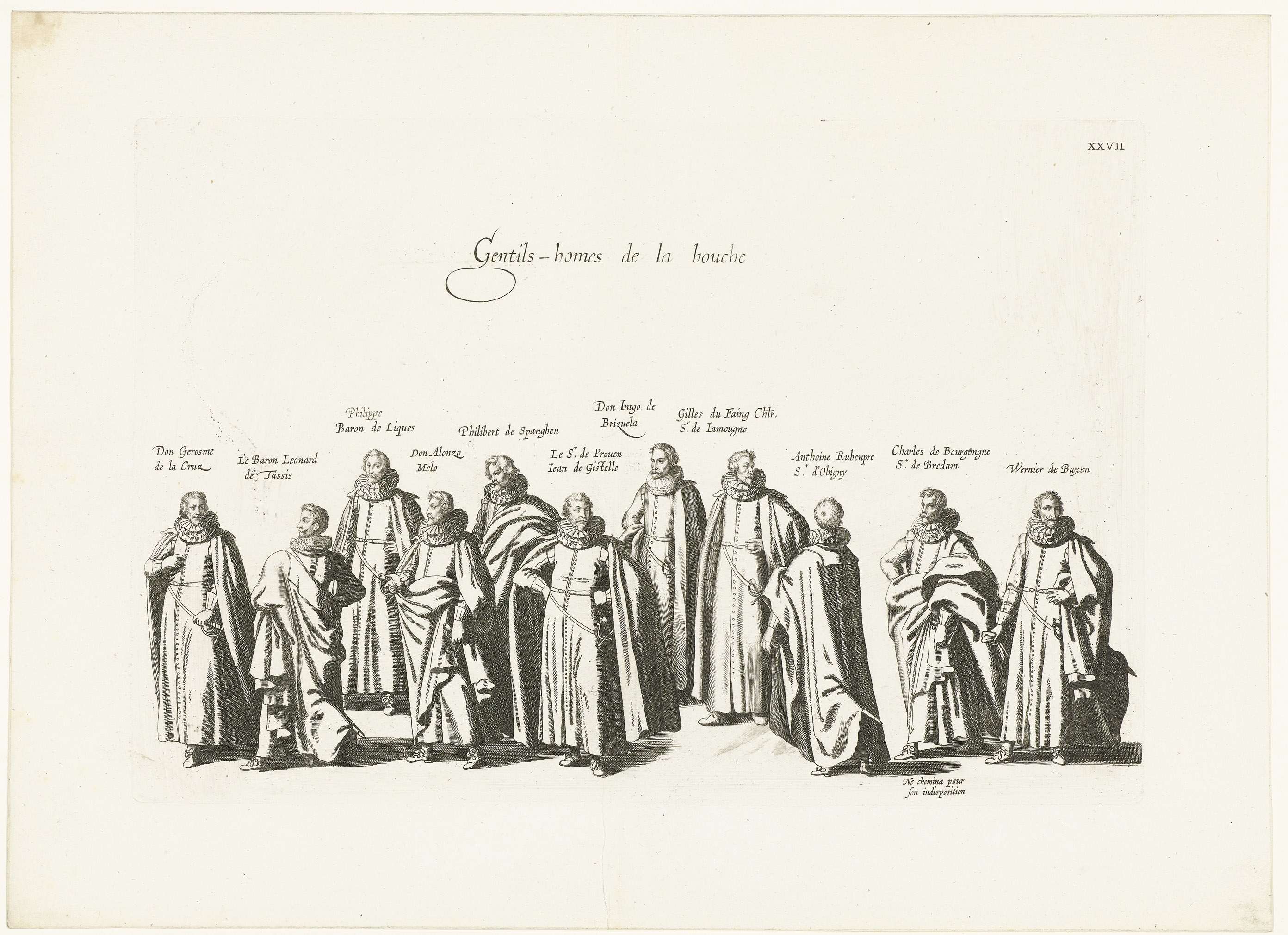 Deelnemers aan de begrafenisstoet. Plaat XXVII in de serie van de begrafenis van aartshertog Albrecht van Oostenrijk te Brussel op 12 maart 1622.