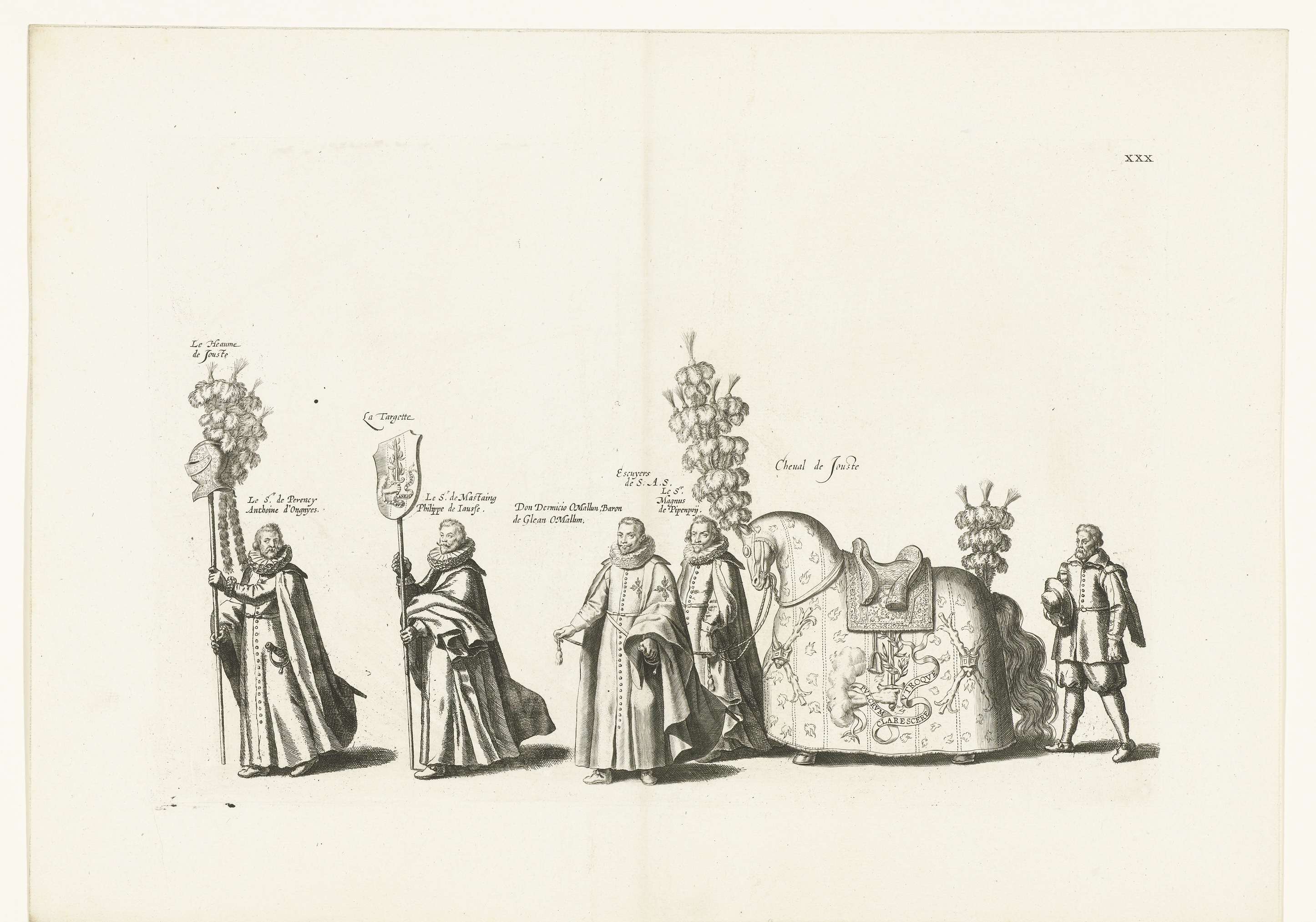 Deelnemers in de begrafenisstoet met attributen van het steekspel. Plaat XXX in de serie van de begrafenis van aartshertog Albrecht van Oostenrijk te Brussel op 12 maart 1622.