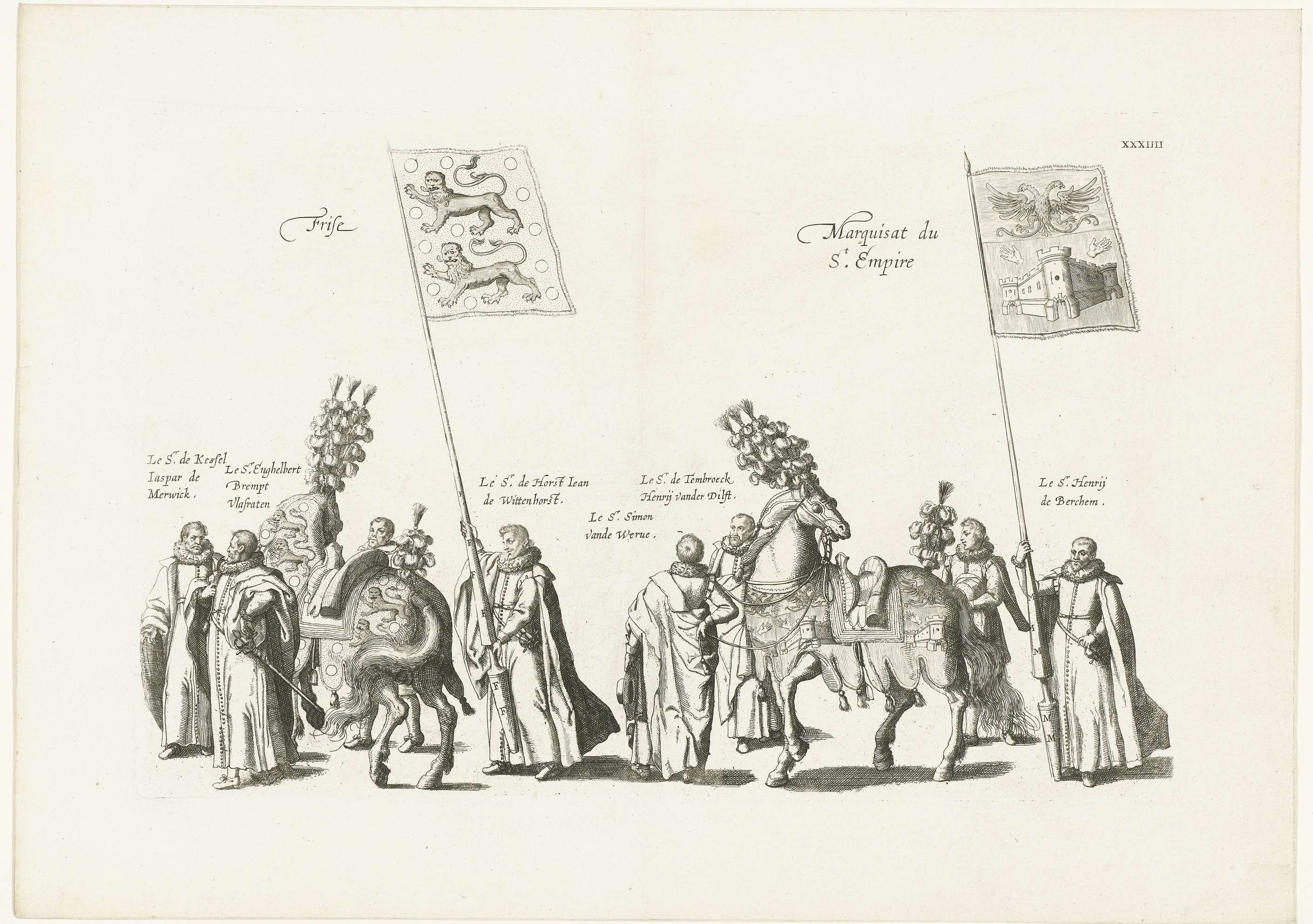 Deelnemers in de begrafenisstoet met vaandels van Friesland en het markgraafschap van Antwerpen. Plaat XXXIIII in de serie van de begrafenis van aartshertog Albrecht van Oostenrijk te Brussel op 12 maart 1622.