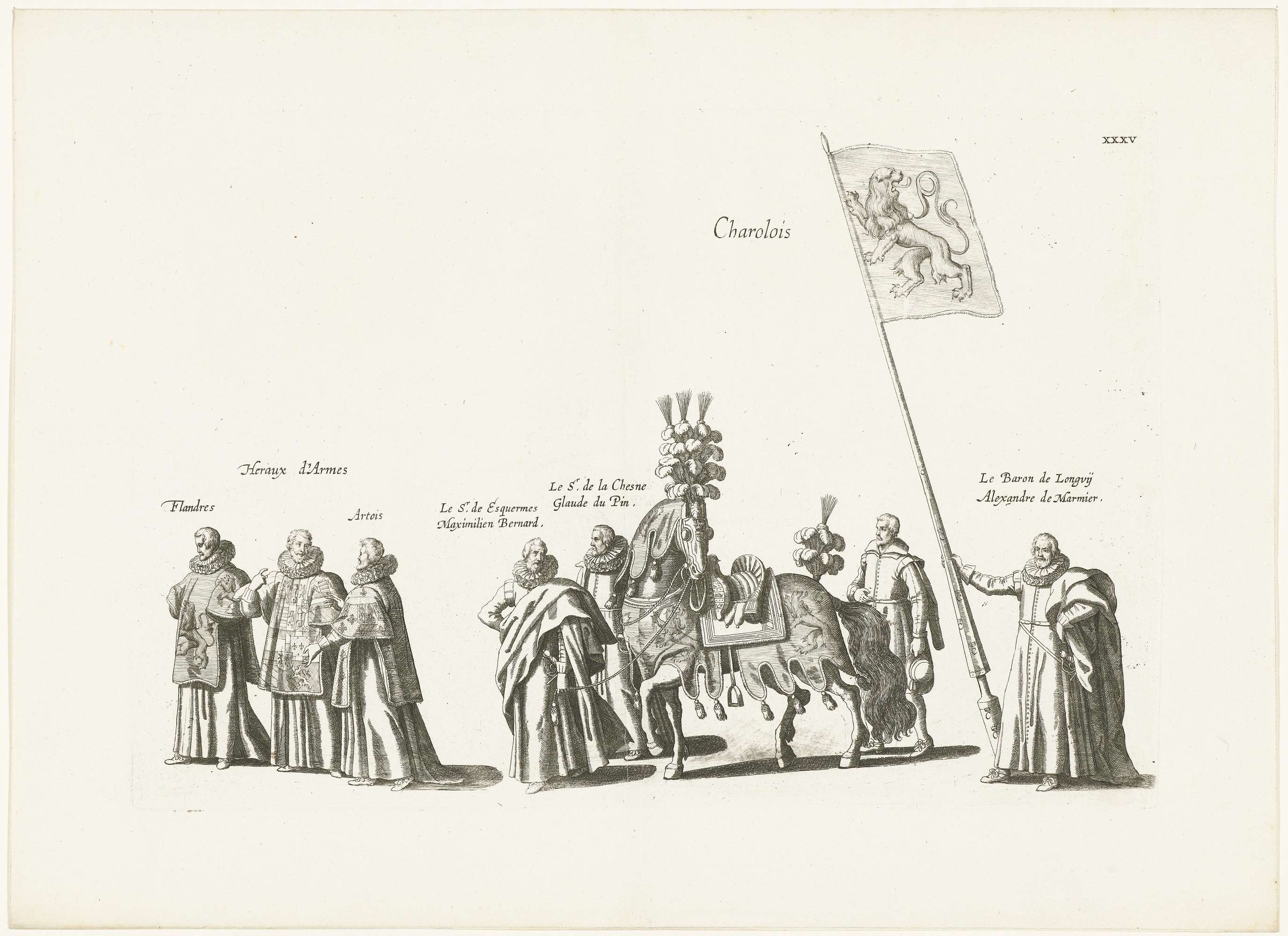 Deelnemers in de begrafenisstoet met vaandel van Charleroi. Plaat XXXV in de serie van de begrafenis van aartshertog Albrecht van Oostenrijk te Brussel op 12 maart 1622.