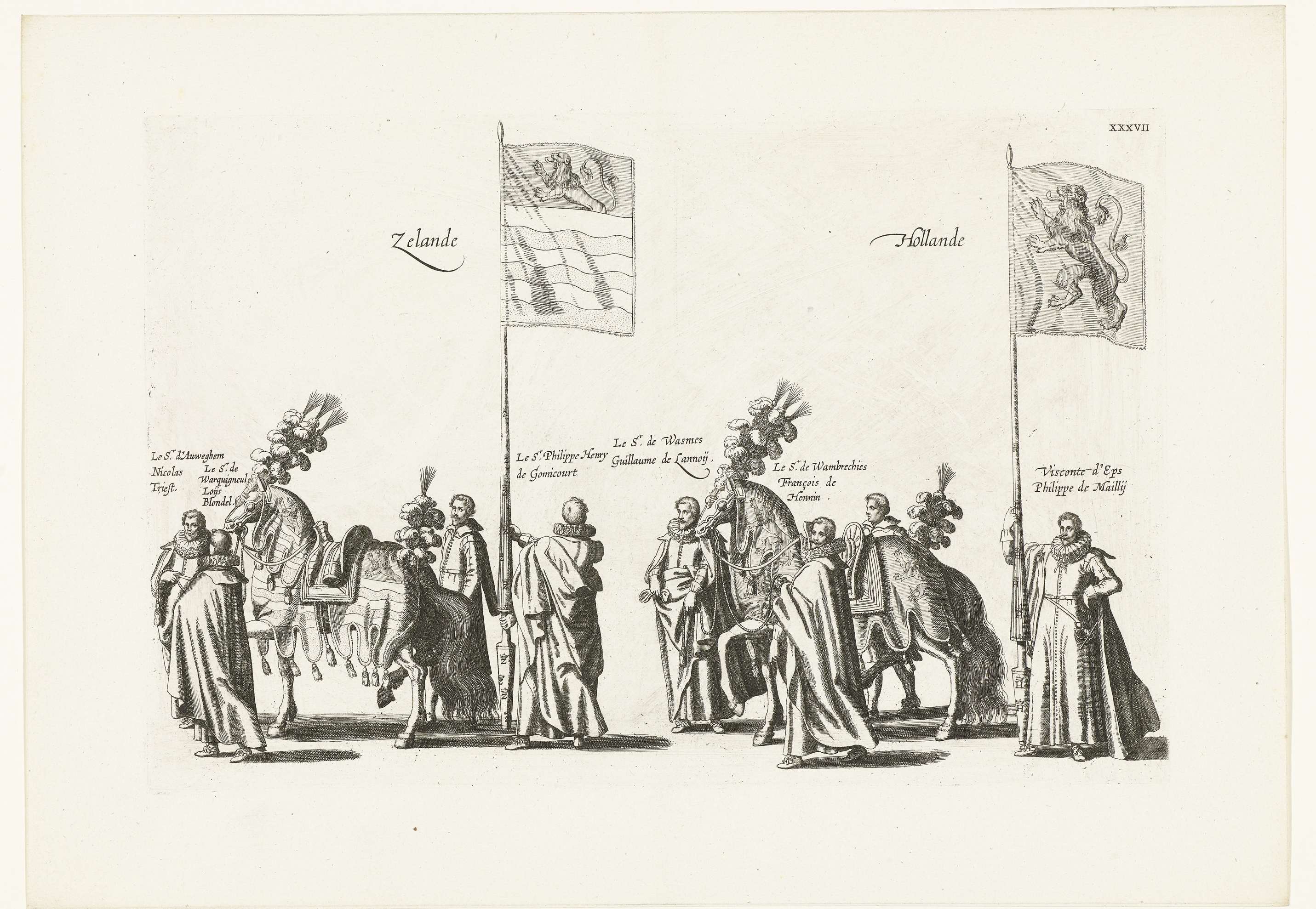 Deelnemers in de begrafenisstoet met de vaandels van Zeeland en Holland. Plaat XXXVII in de serie van de begrafenis van aartshertog Albrecht van Oostenrijk te Brussel op 12 maart 1622.