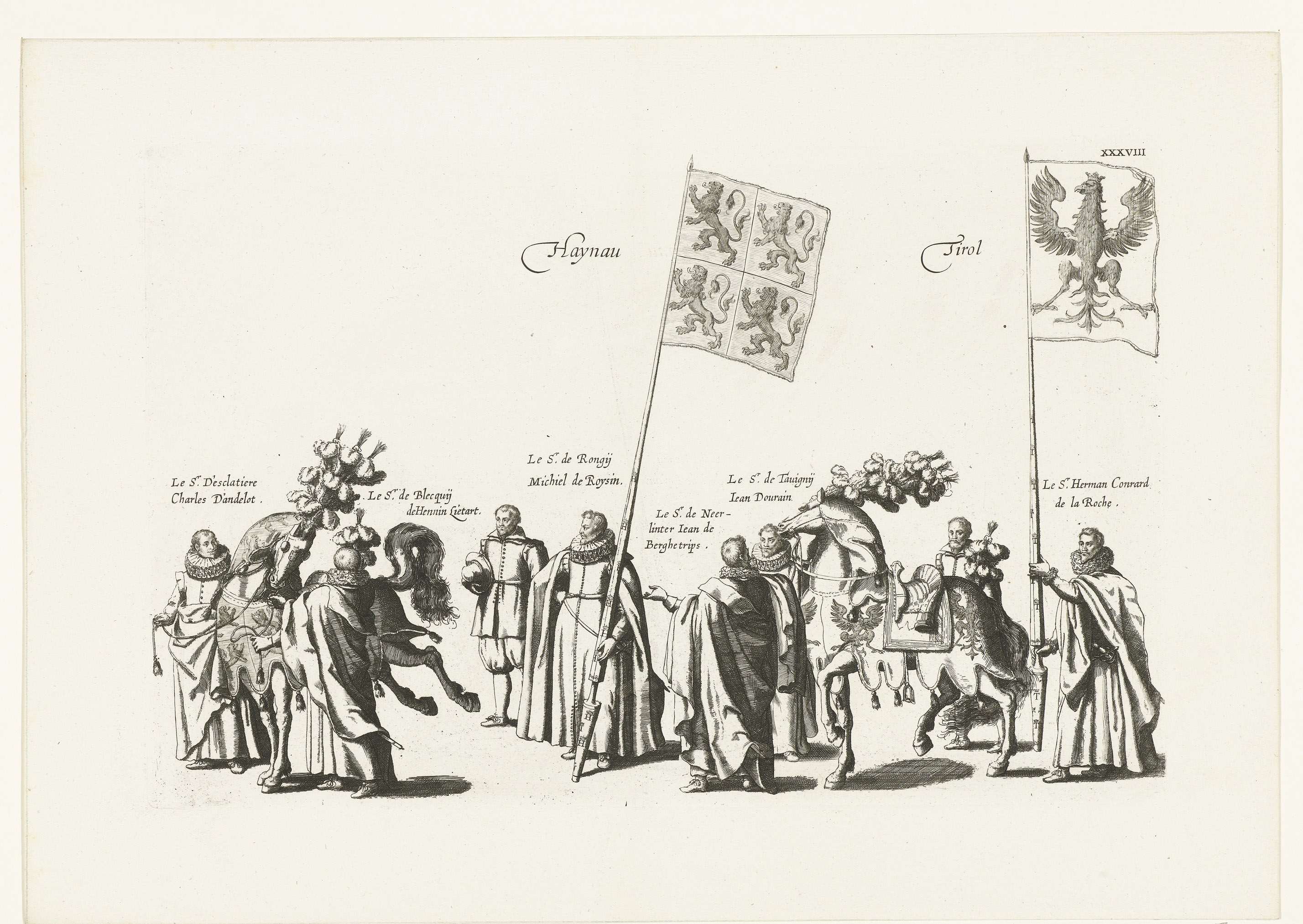 Deelnemers in de begrafenisstoet met de vaandels van Henegouwen en Tirool. Plaat XXXVIII in de serie van de begrafenis van aartshertog Albrecht van Oostenrijk te Brussel op 12 maart 1622.