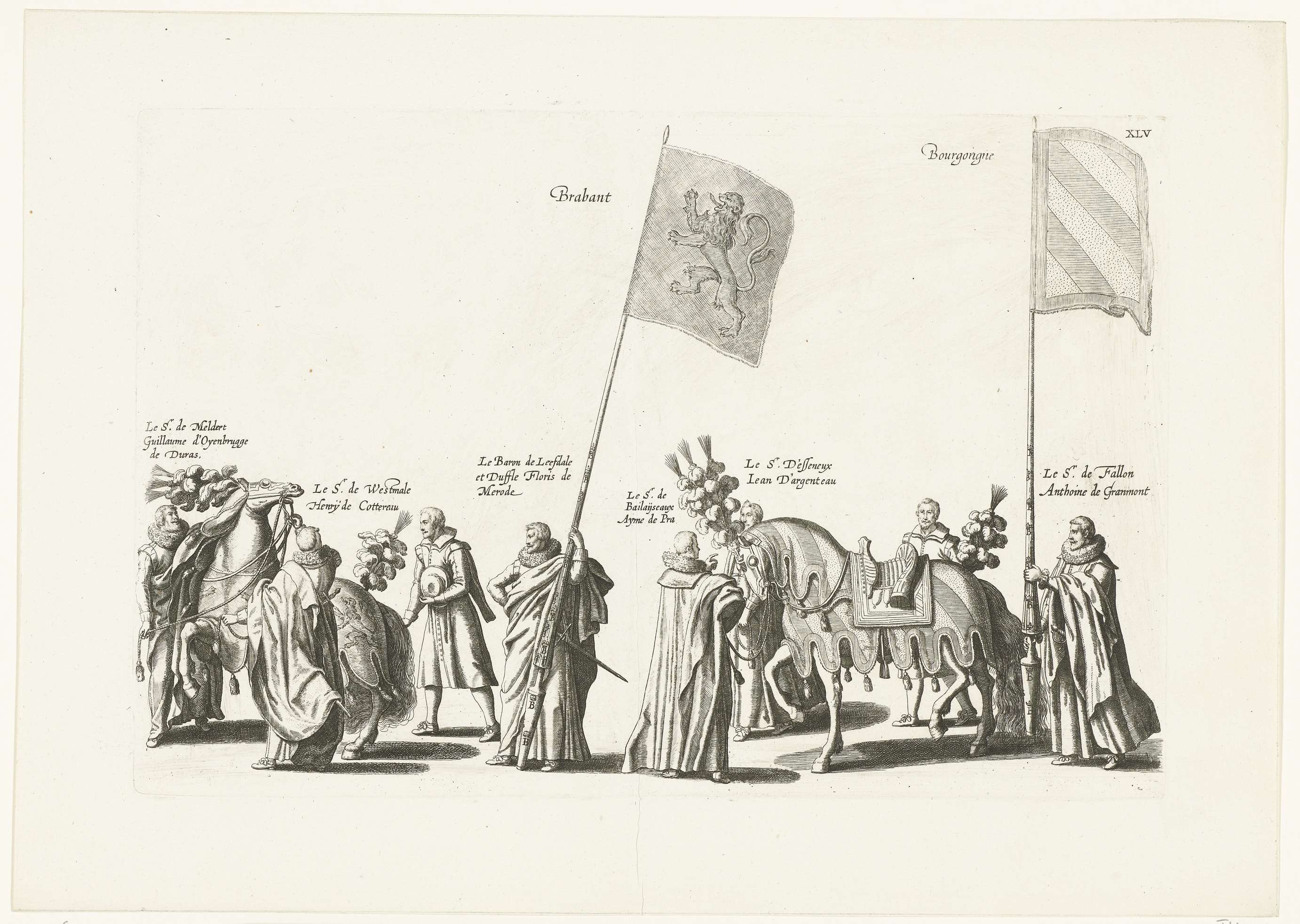 Deelnemers in de begrafenisstoet met de vaandels van Brabant en Bourgondië. Plaat XLV in de serie van de begrafenis van aartshertog Albrecht van Oostenrijk te Brussel op 12 maart 1622.