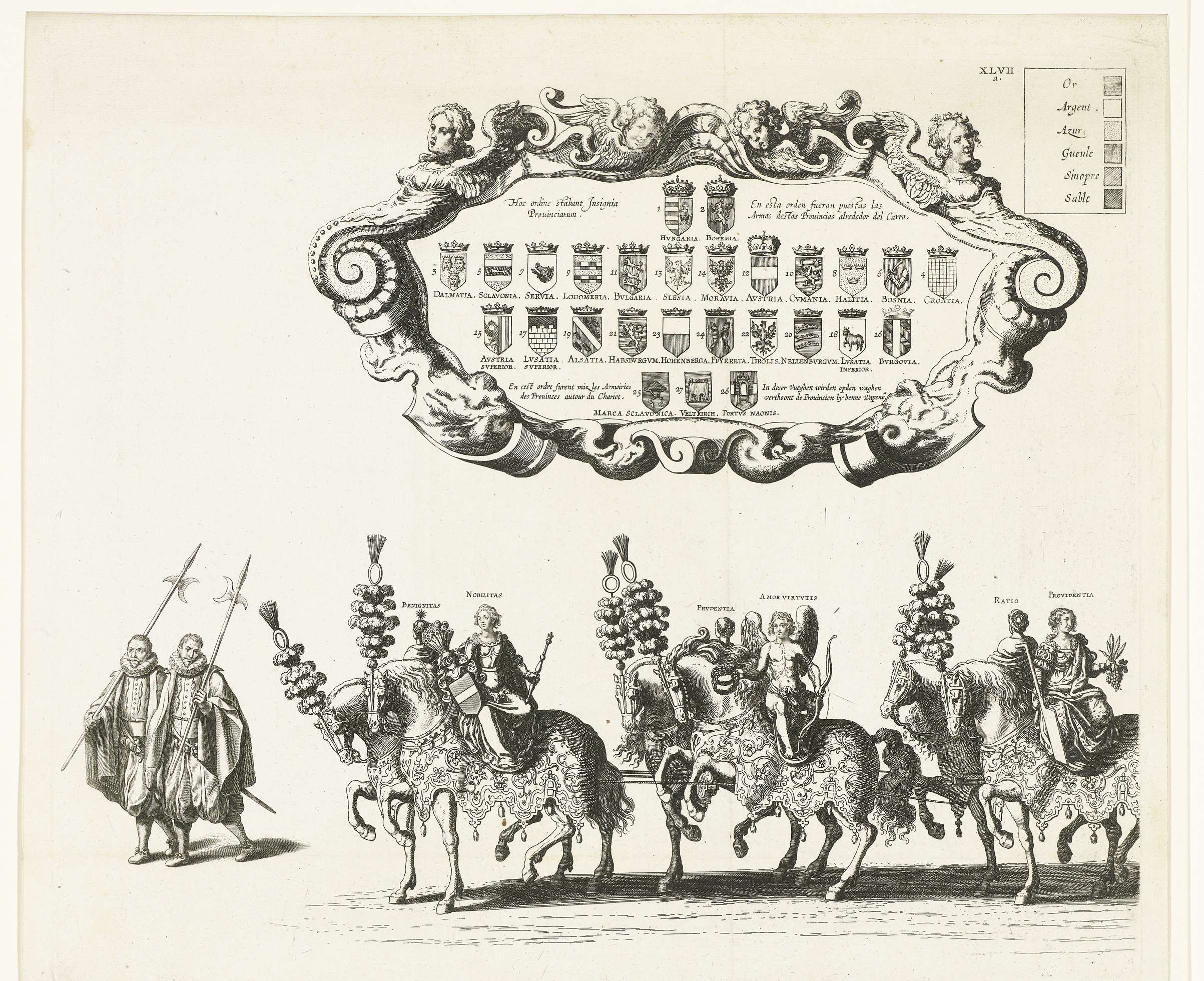 Het voorste deel van de praalwagen in de begrafenisstoet, linkerplaat. De eerste zes paarden die de praalwagen trekken. Bovenaan een cartouche met de op de wagen vertoonde provinciewapens. Plaat XLVIIa in de serie van de begrafenis van aartshertog Albrecht van Oostenrijk te Brussel op 12 maart 1622.