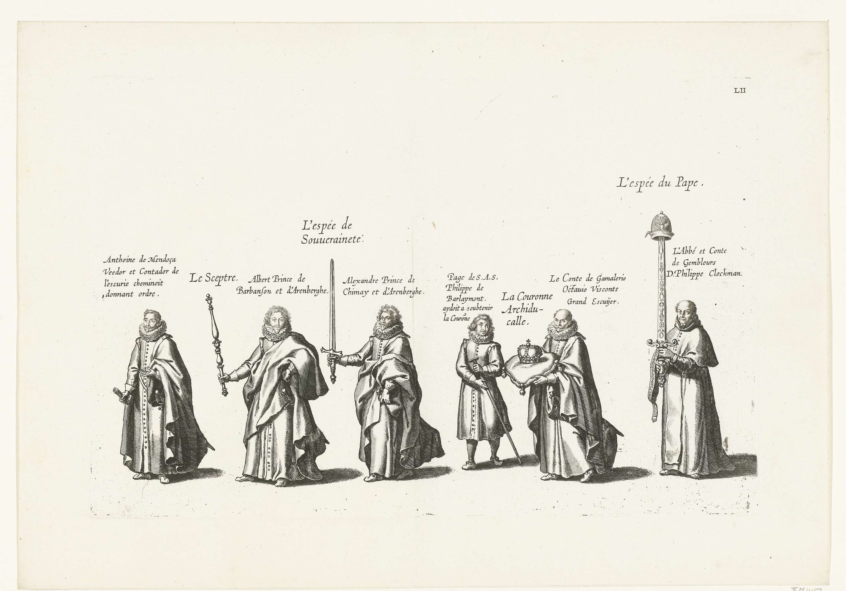 Deelnemers in de begrafenisstoet met scepter, ceremoniële zwaarden en kroon. Plaat LII in de serie van de begrafenis van aartshertog Albrecht van Oostenrijk te Brussel op 12 maart 1622.
