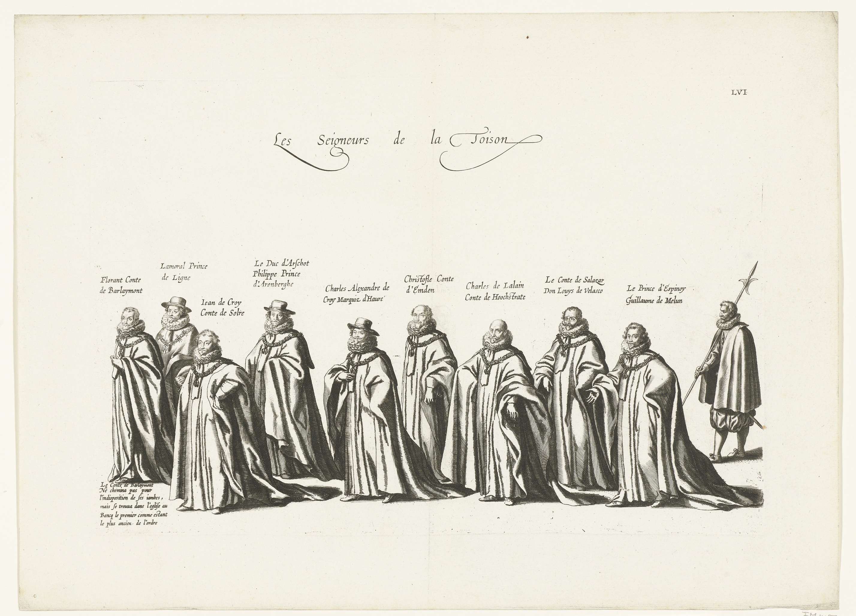 Deelnemers in de begrafenisstoet, de ridders van het Gulden Vlies. Plaat LVI in de serie van de begrafenis van aartshertog Albrecht van Oostenrijk te Brussel op 12 maart 1622.