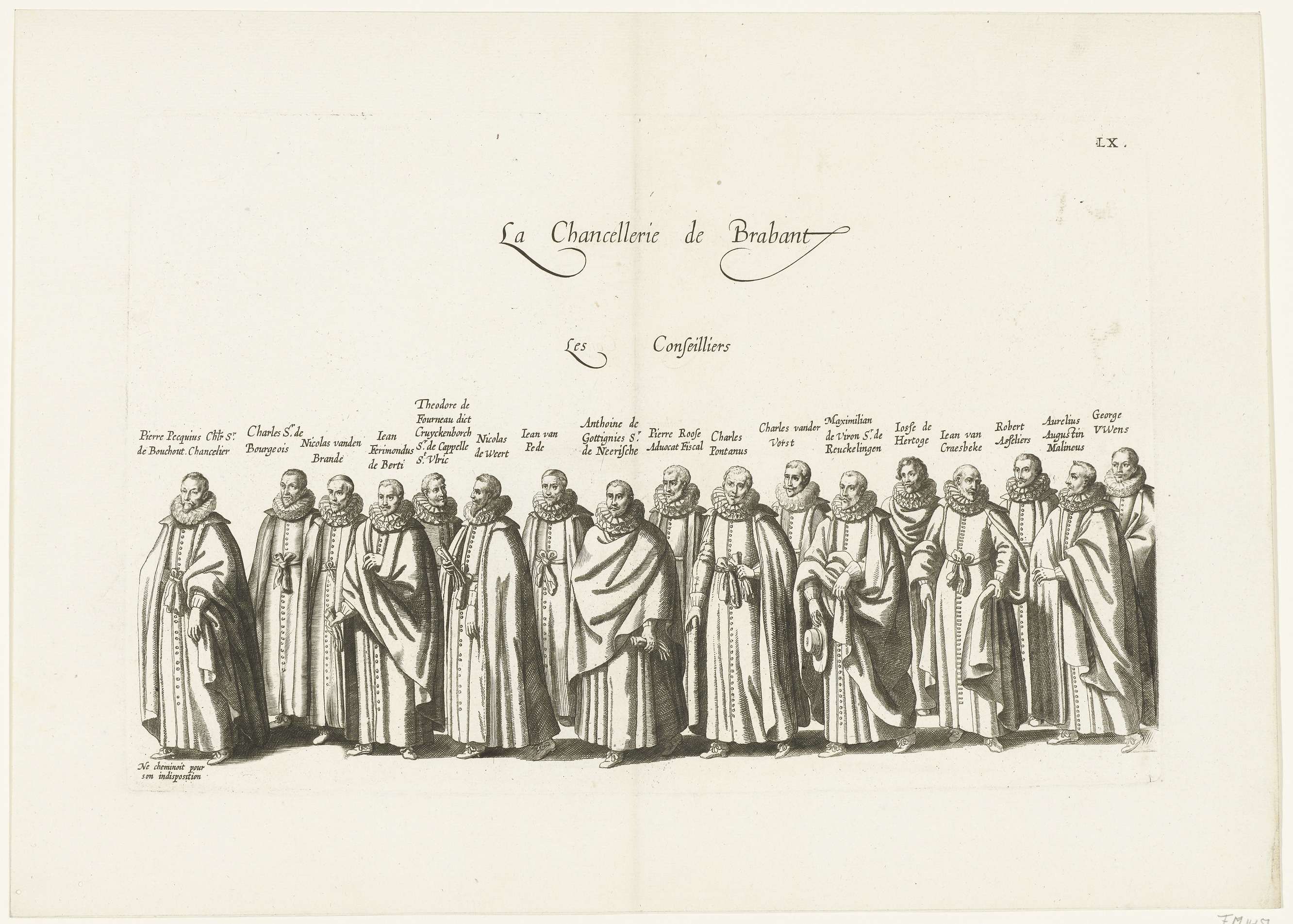 Deelnemers in de begrafenisstoet. Plaat LX in de serie van de begrafenis van aartshertog Albrecht van Oostenrijk te Brussel op 12 maart 1622.