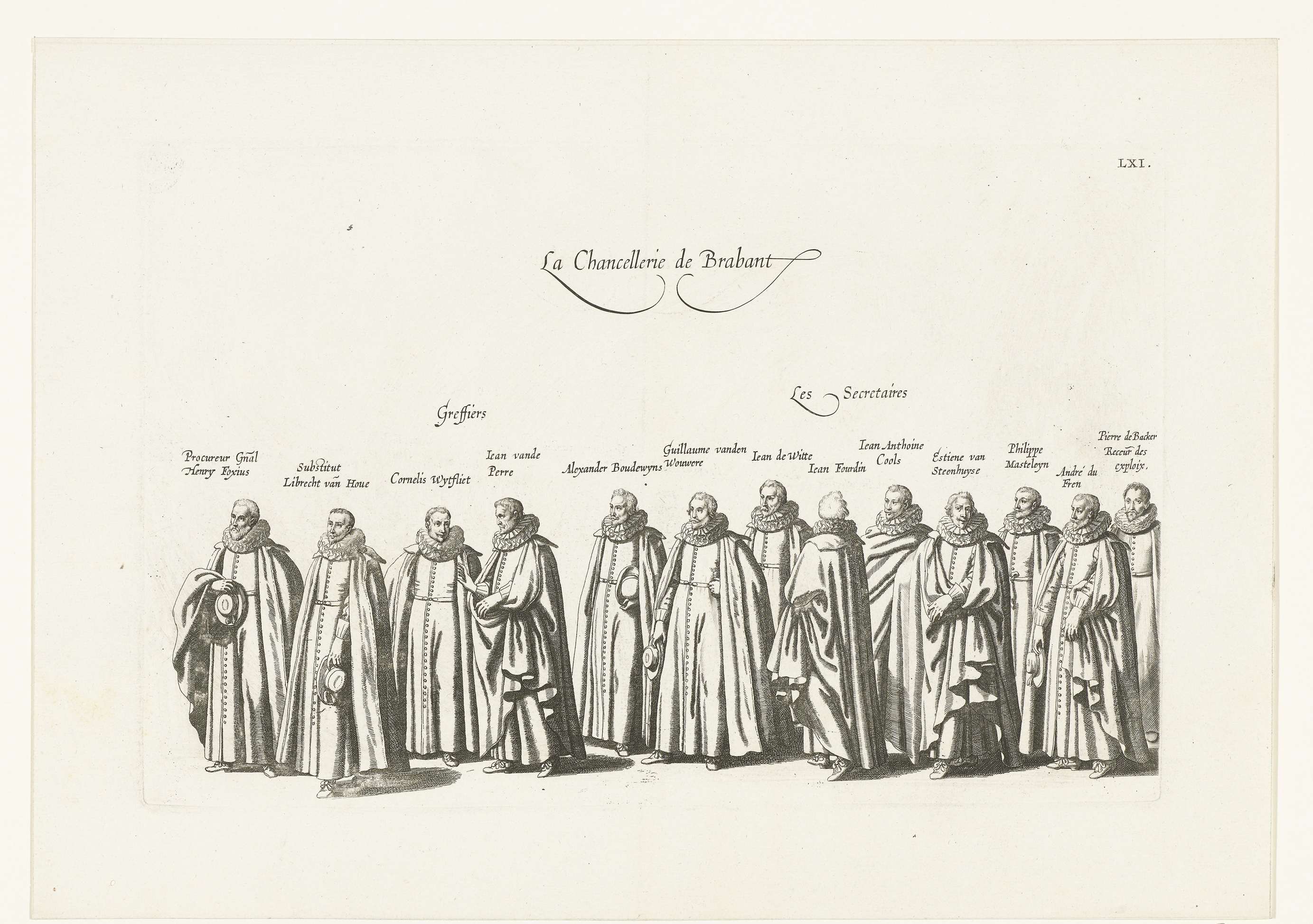 Deelnemers in de begrafenisstoet. Plaat LXI in de serie van de begrafenis van aartshertog Albrecht van Oostenrijk te Brussel op 12 maart 1622.