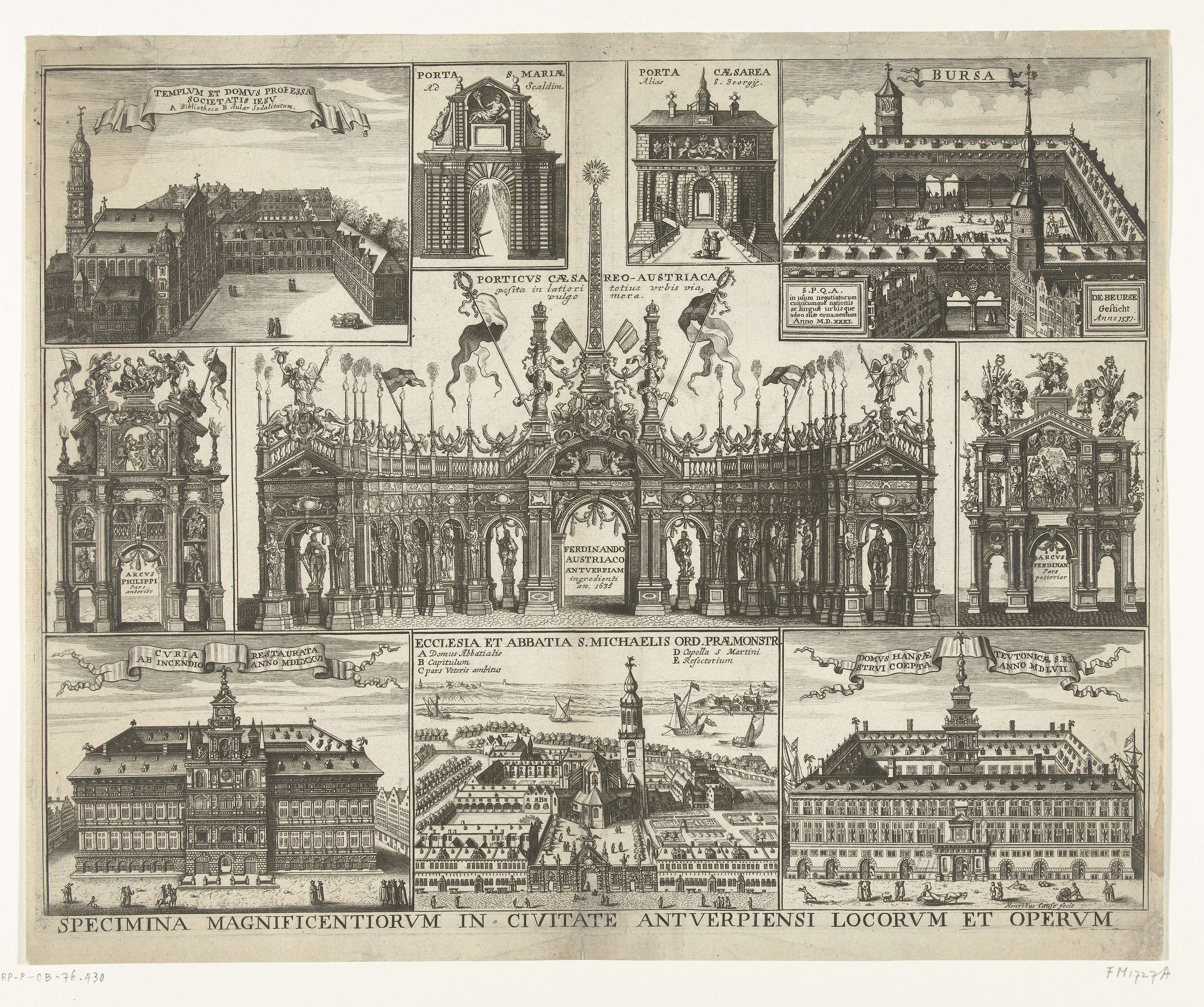 Blad met tien voorstellingen van de intocht van de Kardinaal Infant Ferdinand van Oostenrijk als de nieuwe landvoogd voor de Spaanse Nederlanden, te Antwerpen op 17 april 1635. Verschillende beroemde gebouwen in Antwerpen en de speciaal voor deze gebeurtenis opgerichte triomfpoorten.
