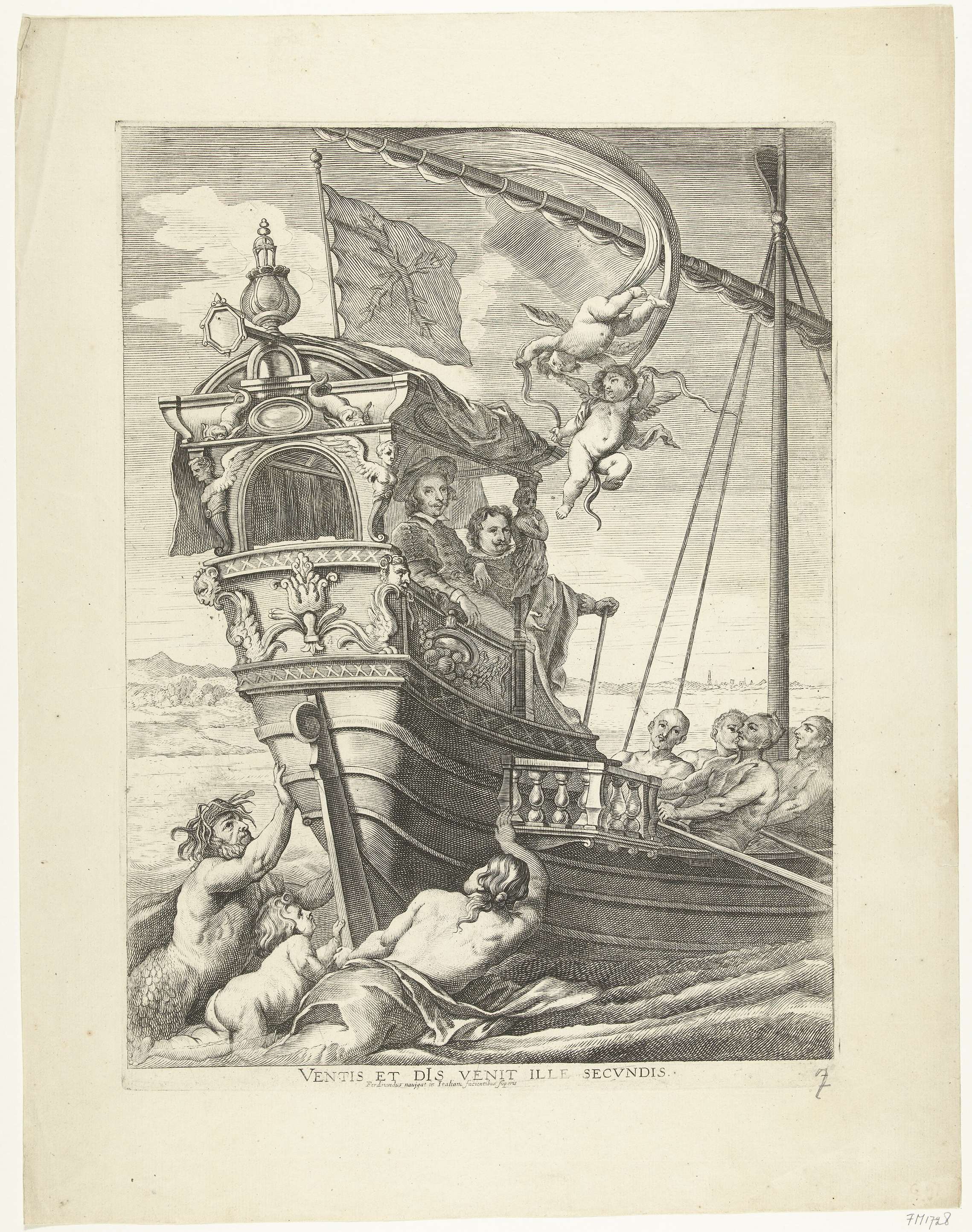 Ferdinands reis over zee van Barcelona naar Genua in Italië (11 april - 5 mei 1633). Ferdinand van Oostenrijk in een galei geroeid door tot slaaf gemaakte mannen. In de lucht engelen, in het water zeewezens. Voorstelling linksboven op de voorzijde van de triomfpoort Arcus Fernandi op de Vrijdagmarkt. Blad nr. 7 in een geheel ...
