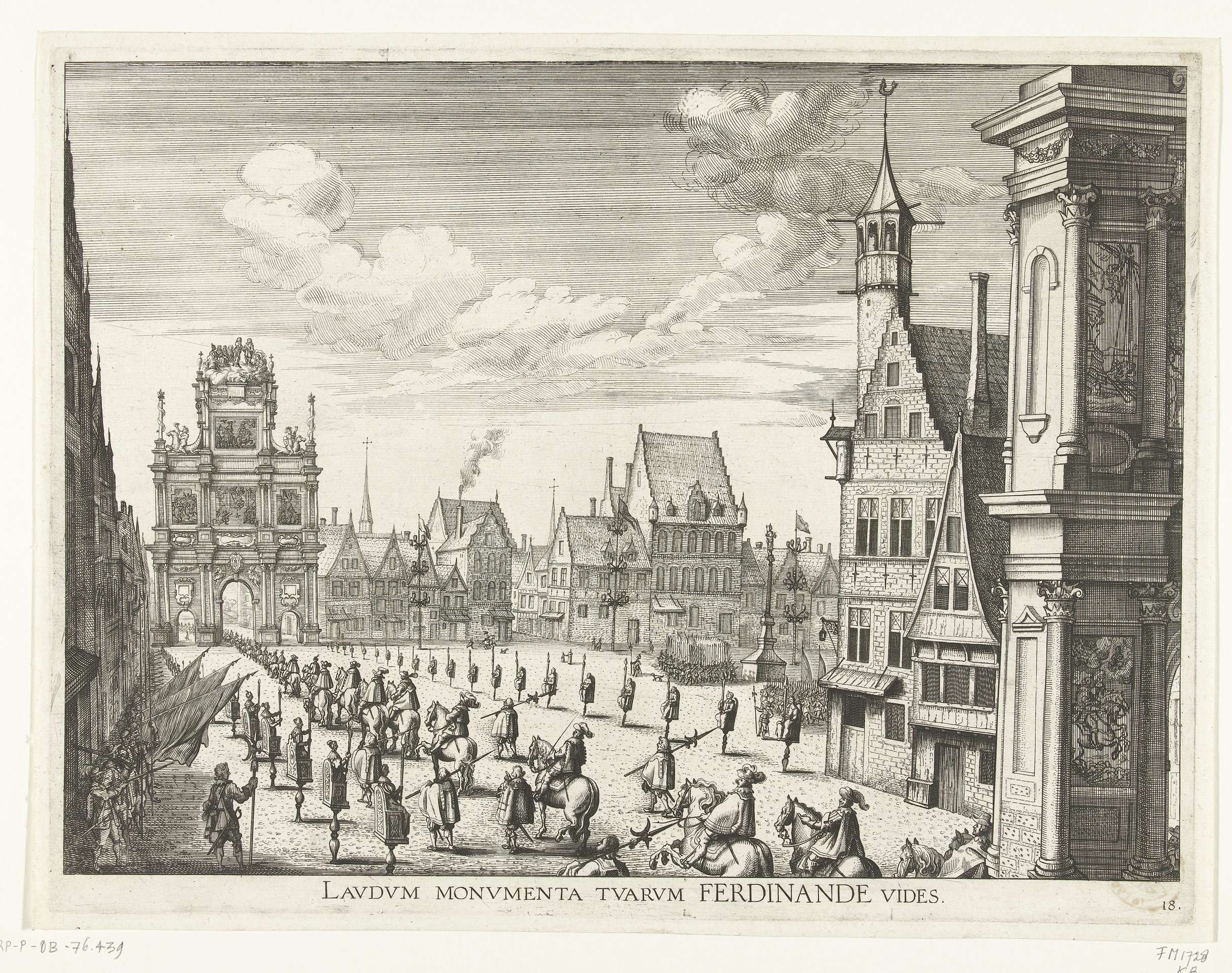 De stoet met Ferdinand van Oostenrijk trekt door de triomfpoorten op de Vrijdagmarkt. Blad nr. 18 in een geheel van 42 platen die de uitgave van de beschrijving van de intocht van de Kardinaal Infant Ferdinand van Oostenrijk te Gent op 28 januari 1635 als de nieuwe landvoogd voor de Spaanse Nederlanden illustreren.