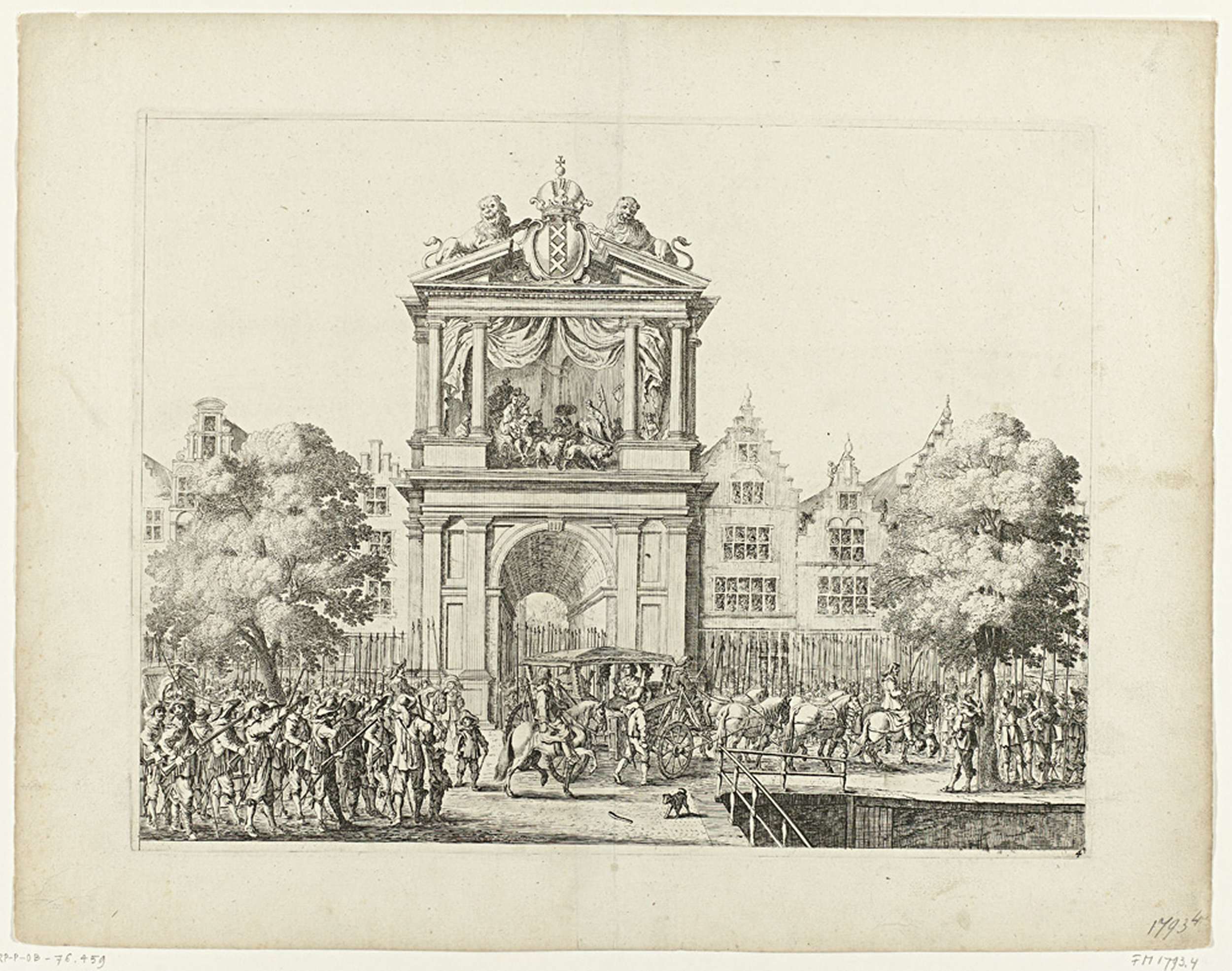 Aankomst van stoet met Maria de' Medici bij de triomfpoort op de Varkenssluis, 1638