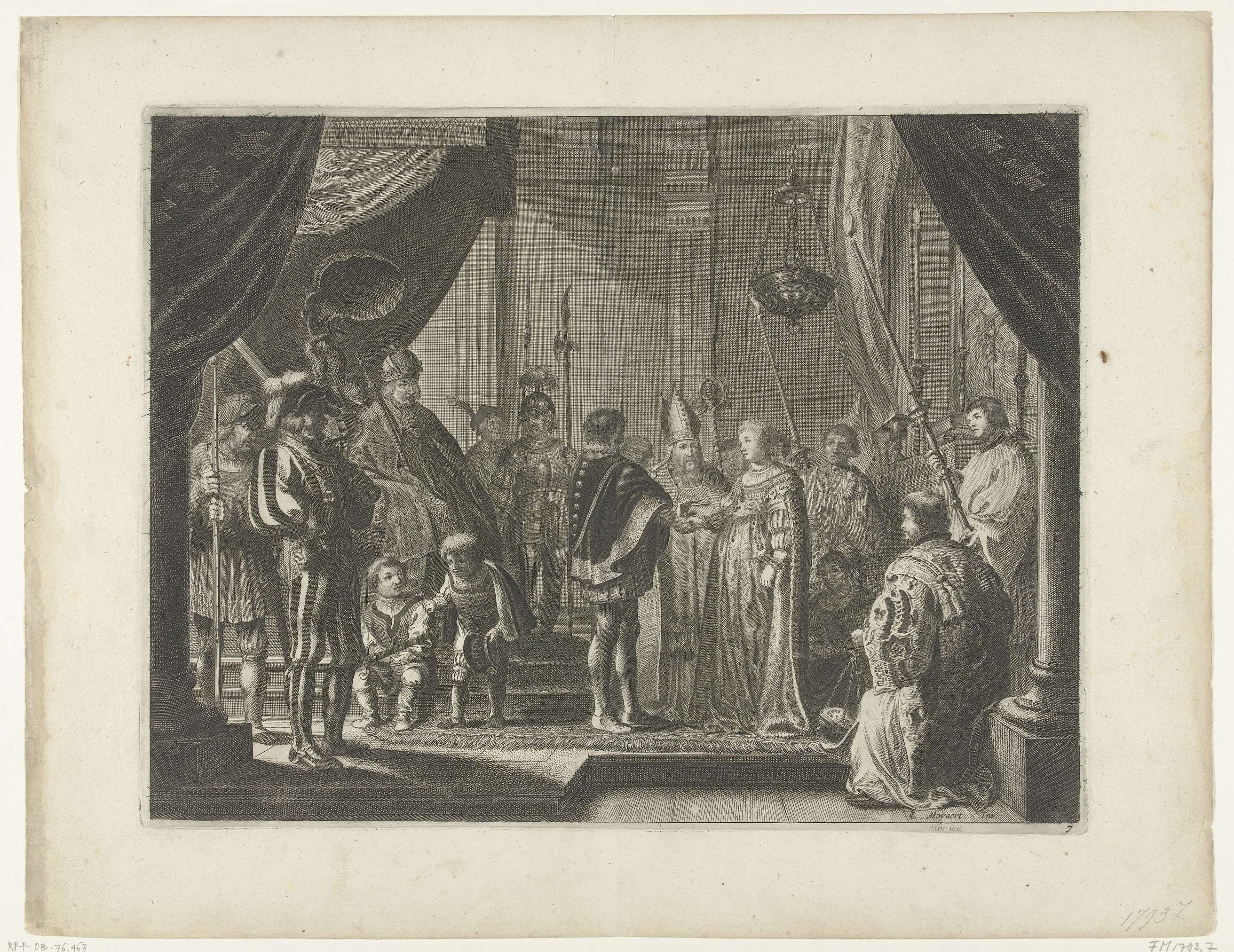 Tableau vivant van het huwelijk van de ouders van Maria de' Medici - Francesco I de' Medici en Johanna van Oostenrijk - in 1565. Links keizer Ferdinand I. Voorstelling gebruikt in het watertheater op het Rokin. Rechtsonder genummerd: 7. Plaat 7 van de illustraties bij de beschrijving van de feestelijkheden rond het bezoek van Maria ...