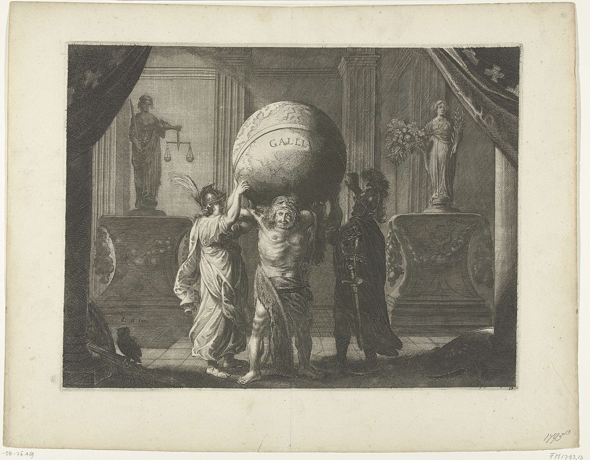 Tableau vivant. Lodewijk XIII, gekleed als Hercules, neemt de globe van het tot een eenheid herstelde Franse Rijk op zijn schouders. Minerva en Mars helpen hem daarbij. Voorstelling gebruikt in het watertheater op het Rokin. Rechtsonder genummerd: 13. Plaat 13 van de illustraties bij de beschrijving van de feestelijkheden bij het bezoek van Maria de' ...