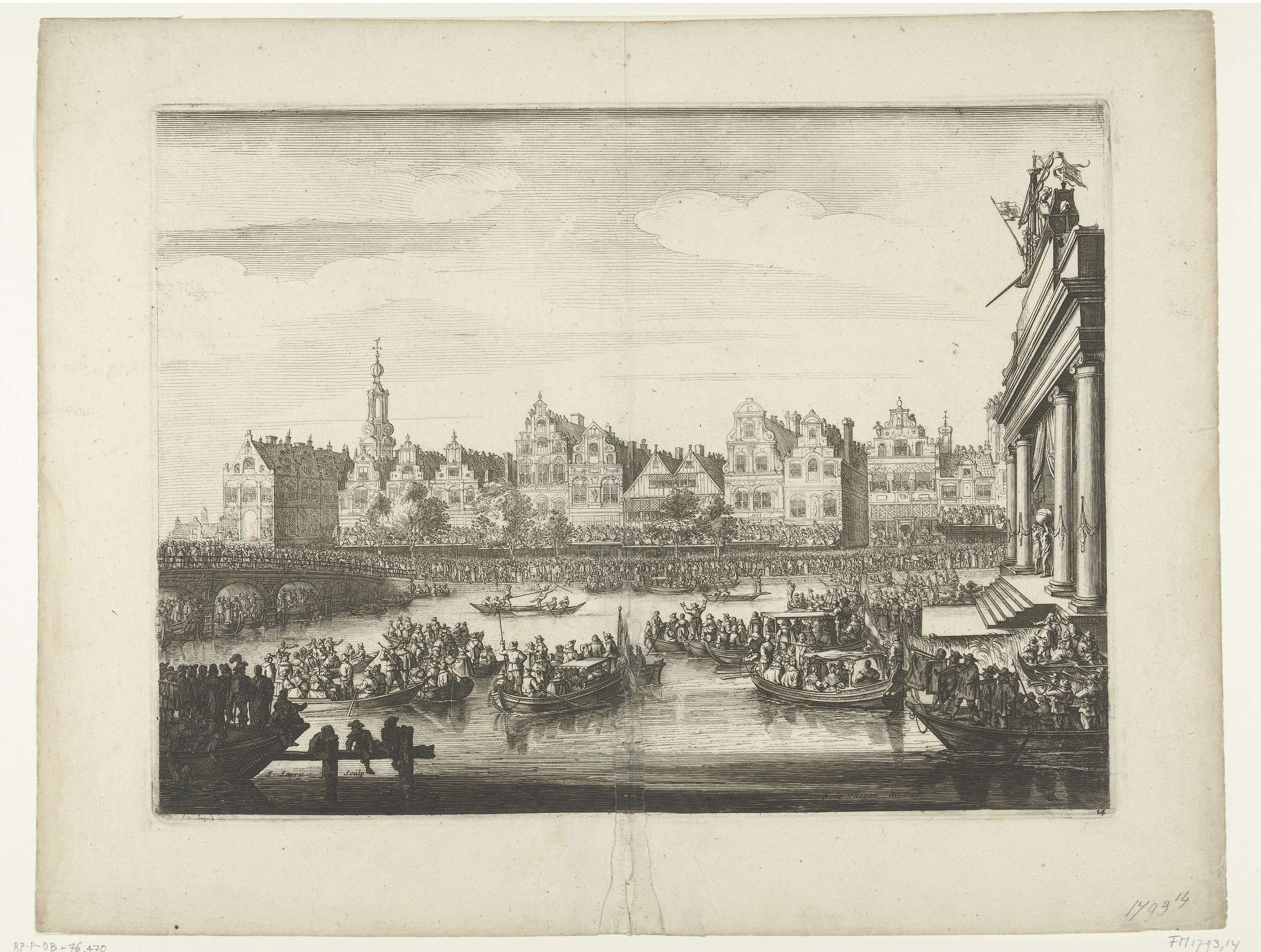 Steekspel in boten bij het drijvende theater op het Rokin, gezien vanuit het zuiden. Rechts het drijvende theater. De gasten en vele anderen in bootjes op het water. Op de kades veel toeschouwers. Rechtsonder genummerd: 14. Plaat 14 van de illustraties bij de beschrijving van de feestelijkheden rond het bezoek van Maria de Medici aan ...