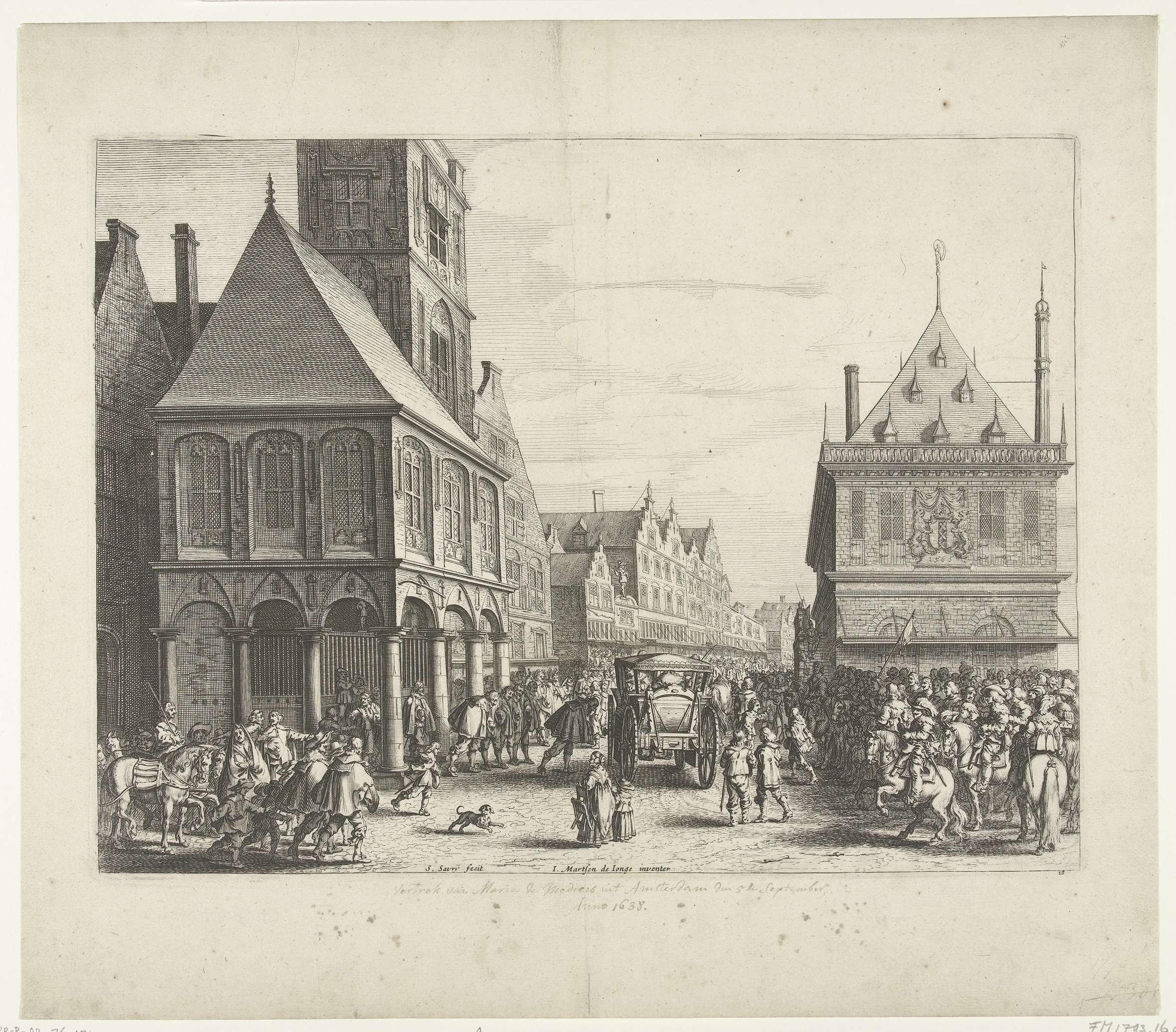 Het vertrek van de koningin op 5 september 1638. De vier Amsterdamse burgemeesters nemen afscheid van Maria de' Medici op de Dam tussen het Oude Stadhuis en de Waag. Op de voorgrond een hond. Rechtsonder genummerd: 16. Plaat 16 van de illustraties bij de beschrijving van de feestelijkheden rond het bezoek van Maria de' Medici ...