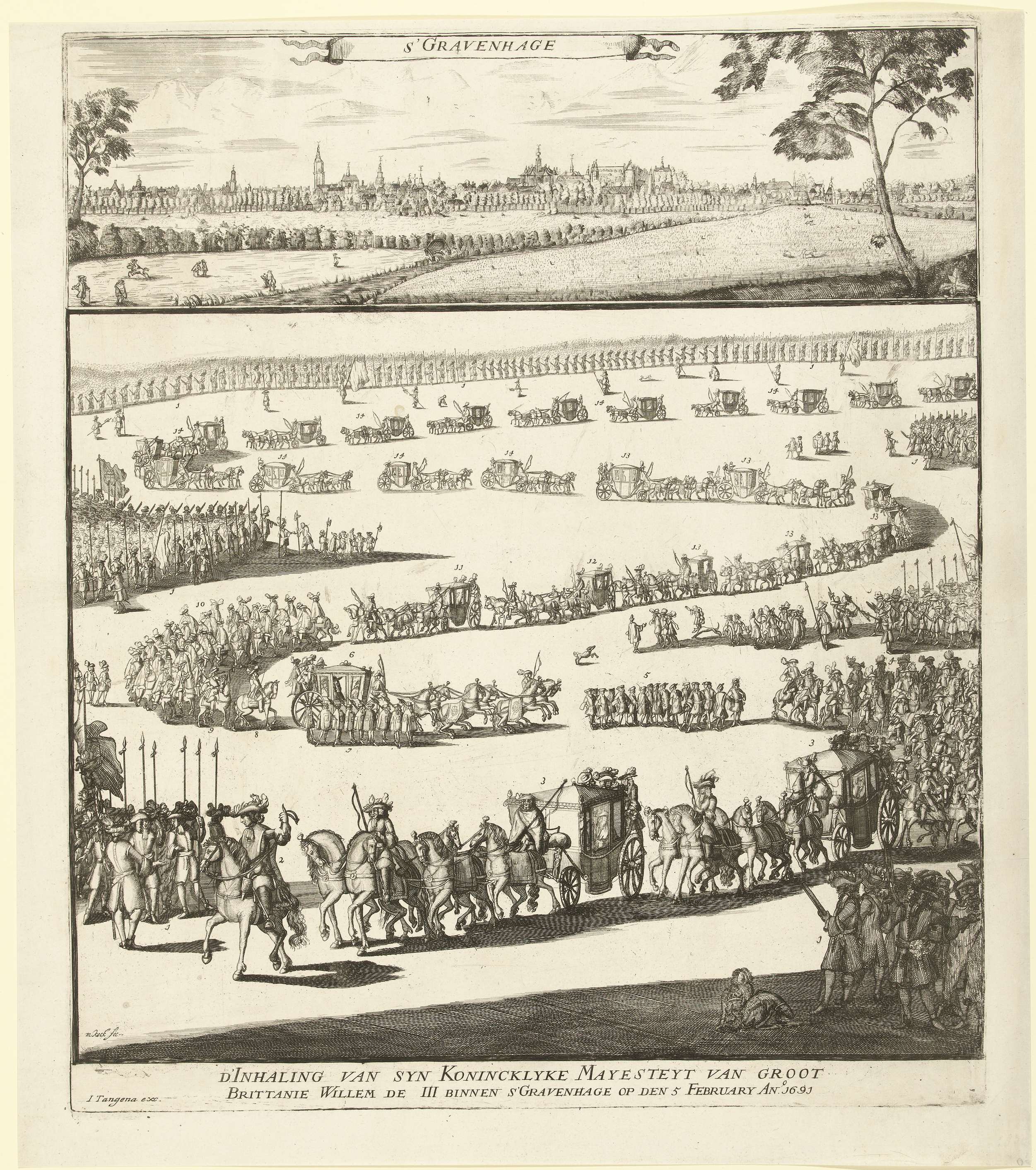 Intocht van koning Willem III te Den Haag, 5 februari 1691. Stoet van rijtuigen trekt in vijf rijen over een plein. Bovenaan een gezicht op Den Haag. Een verklaring voor de cijfers 1-14 in de voorstelling ontbreekt.
