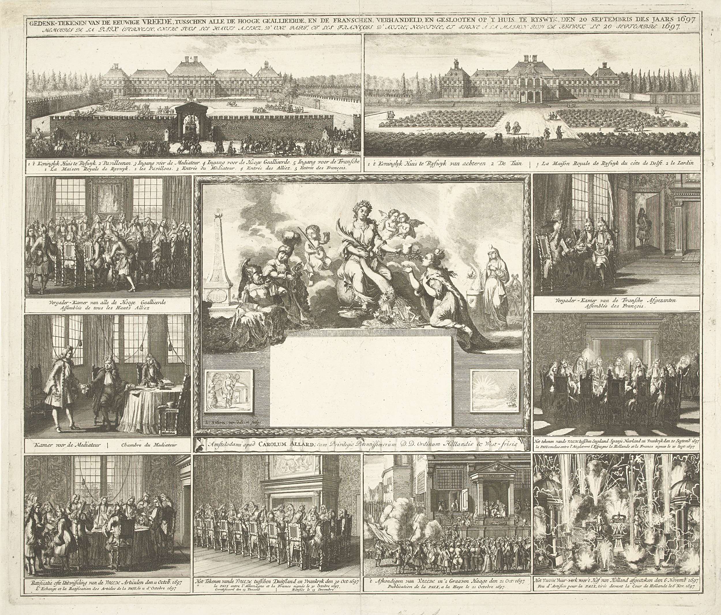 Gedenkteken van de Vrede van Rijswijk, gesloten op 20 september 1697 in het Huis te Nieuburch in Rijswijk. Centraal een allegorische voorstelling met een blanco paneel, omringd door kleinere voorstellingen van het huis te Rijswijk, de vredesonderhandelingen, de bekendmaking van de vrede en de viering van de vrede met vuurwerk te Den Haag. Bij de ...