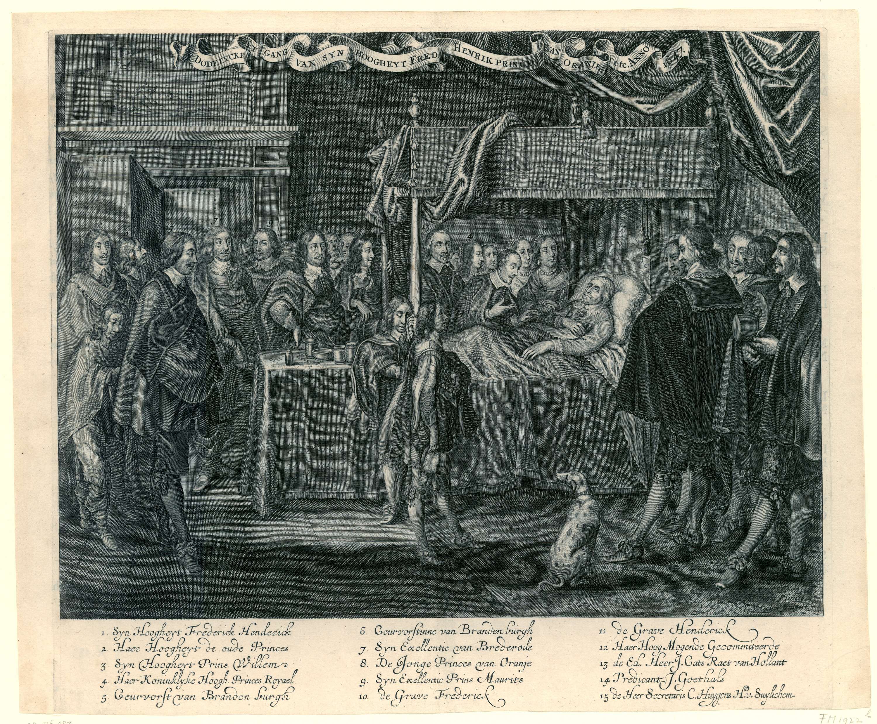 Het sterfbed van Frederik Hendrik. De prins wordt in zijn laatste momenten getroost door de predikant J. Goethals. De directe familieleden van de prins en verschillende bestuurders hebben zich om het bed verzameld. In de voorstelling worden zij met cijfers aangeduid. In de legenda 1-15 onder de voorstelling staan de corresponderende namen. Dit exemplaar heeft ...