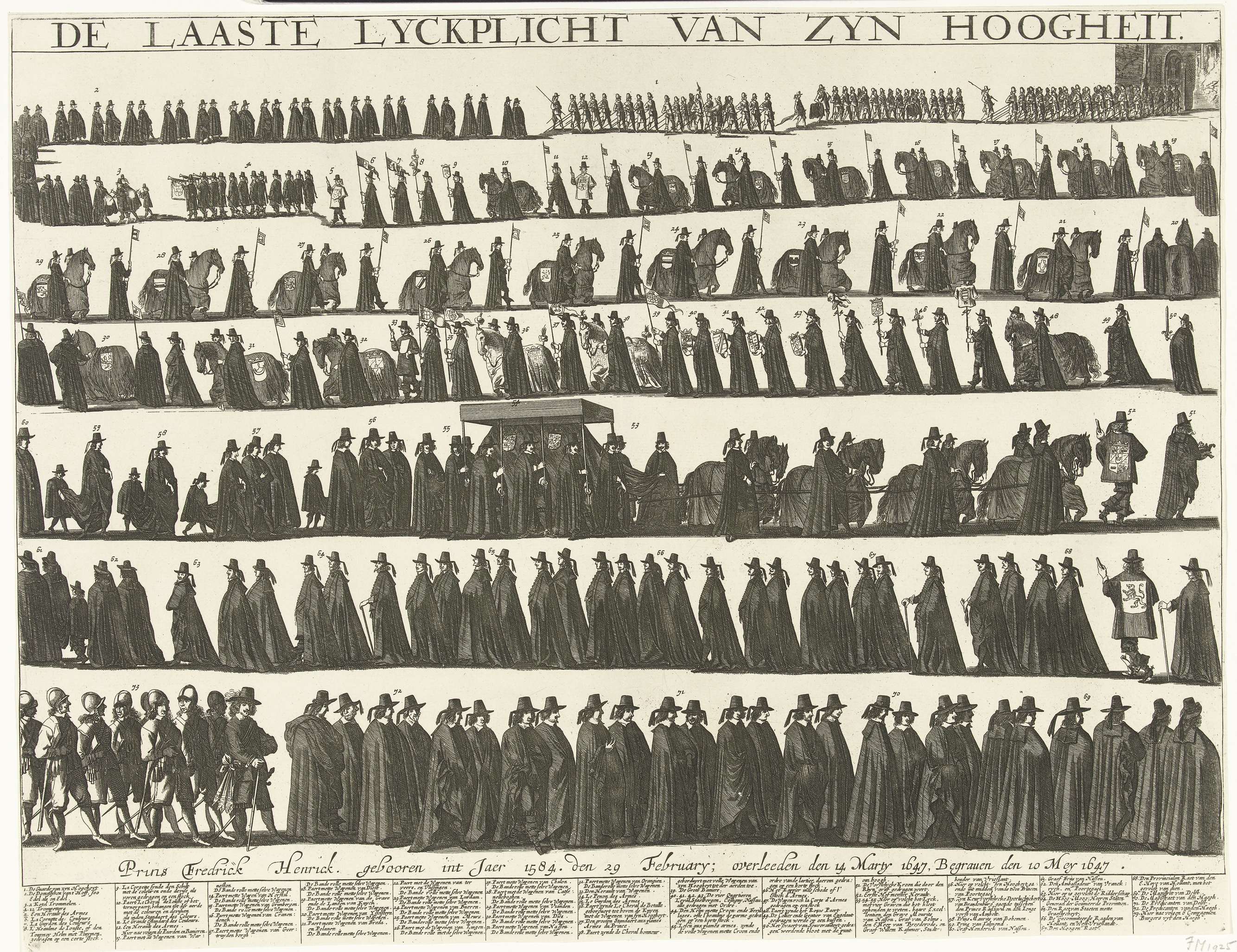 De begrafenisoptocht met de kist met het lichaam van Frederik Hendrik in zeven rijen. Lijkstatie gehouden op 10 mei 1647 te 's-Gravenhage. Onder de voorstelling staat de legenda met de namen van de deelnemers aan de stoet genummerd 1-73. Vóór de aanduiding linksboven: Tweede Deel. Fol: 215.