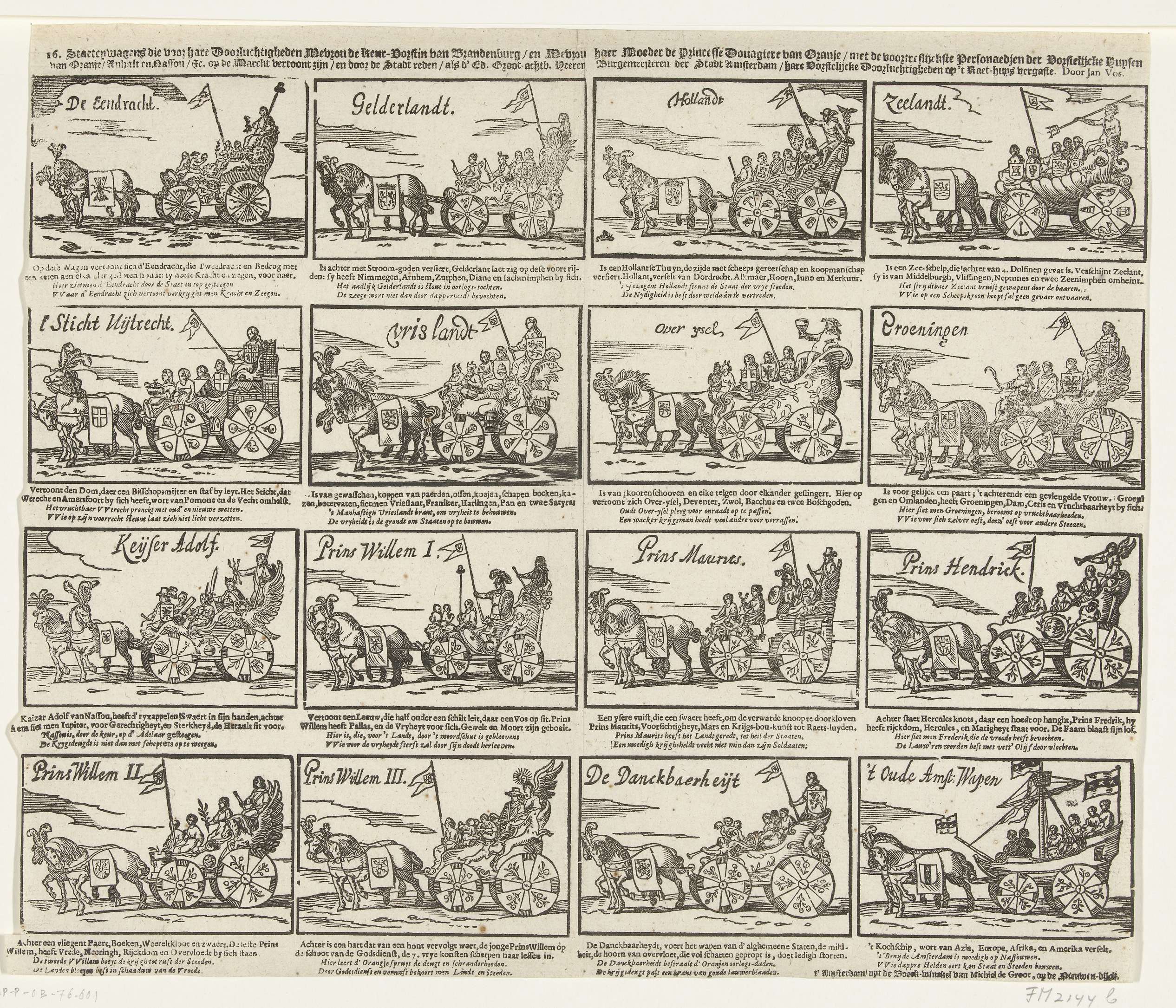 Blad met de zestien staatsiewagens gebruikt bij het bezoek van de Louise Henriëtte, gravin van Nassau en keurvorstin van Brandenburg en haar moeder Amalia van Solms aan Amsterdam, augustus 1659. Zestien praalwagens waarvan zeven de provincies verbeelden, twee de begrippen Eendracht en Dankbaarheid, zes voorouders en de laatste kar in de vorm van het oude ...
