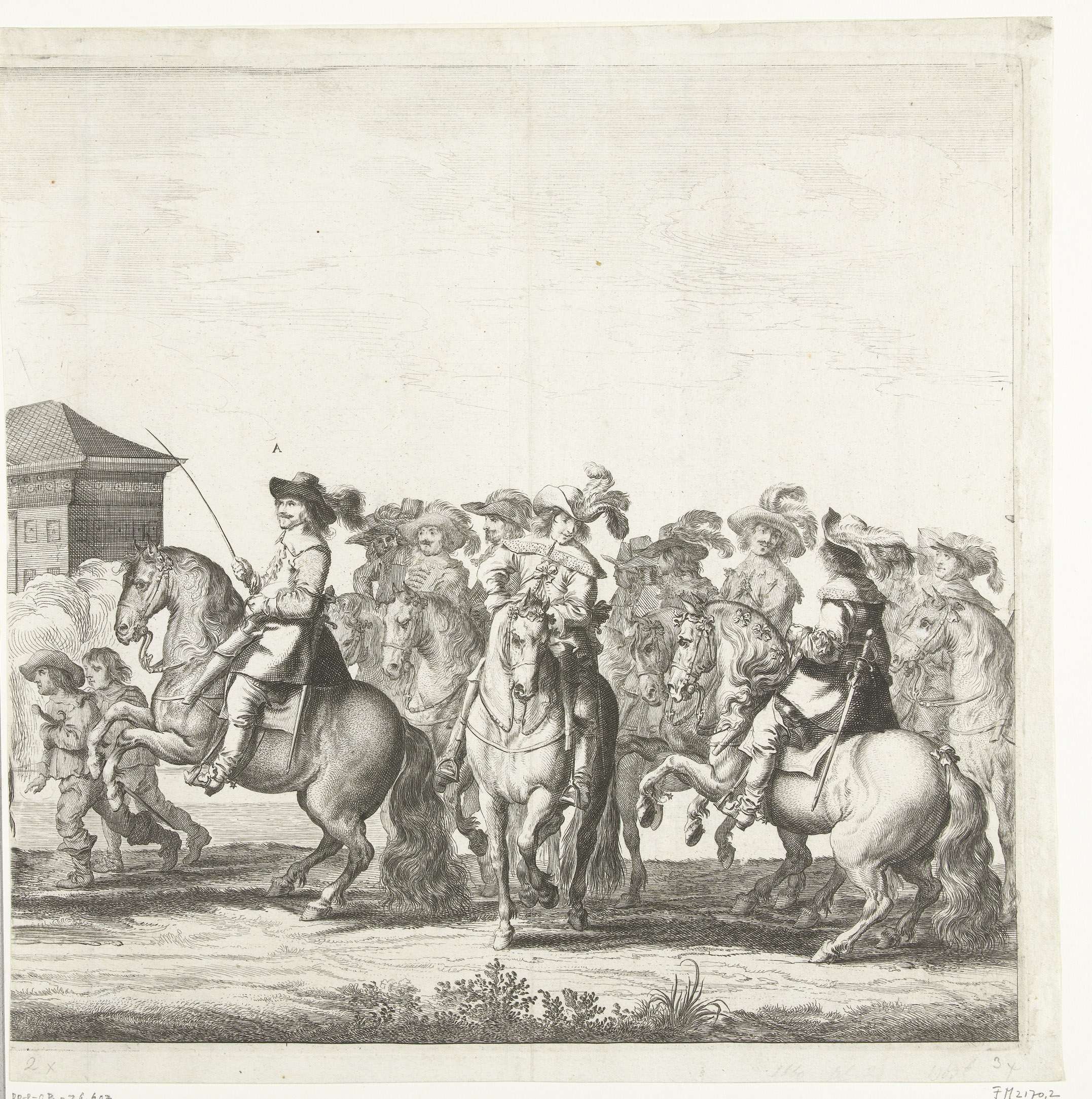 Bezoek van de Maria Henrietta Stuart, prinses van Oranje, vergezeld door Amalia van Solms, de jonge prins Willem III en anderen te Amsterdam, 15 juni 1660. De aankomst van de stoet met ruiters bij de Haarlemmerpoort. De voorste ruiter gemerkt met de letter A. Tweede plaat in een ongemonteerd ensemble bestaande uit een zeven bladen ...