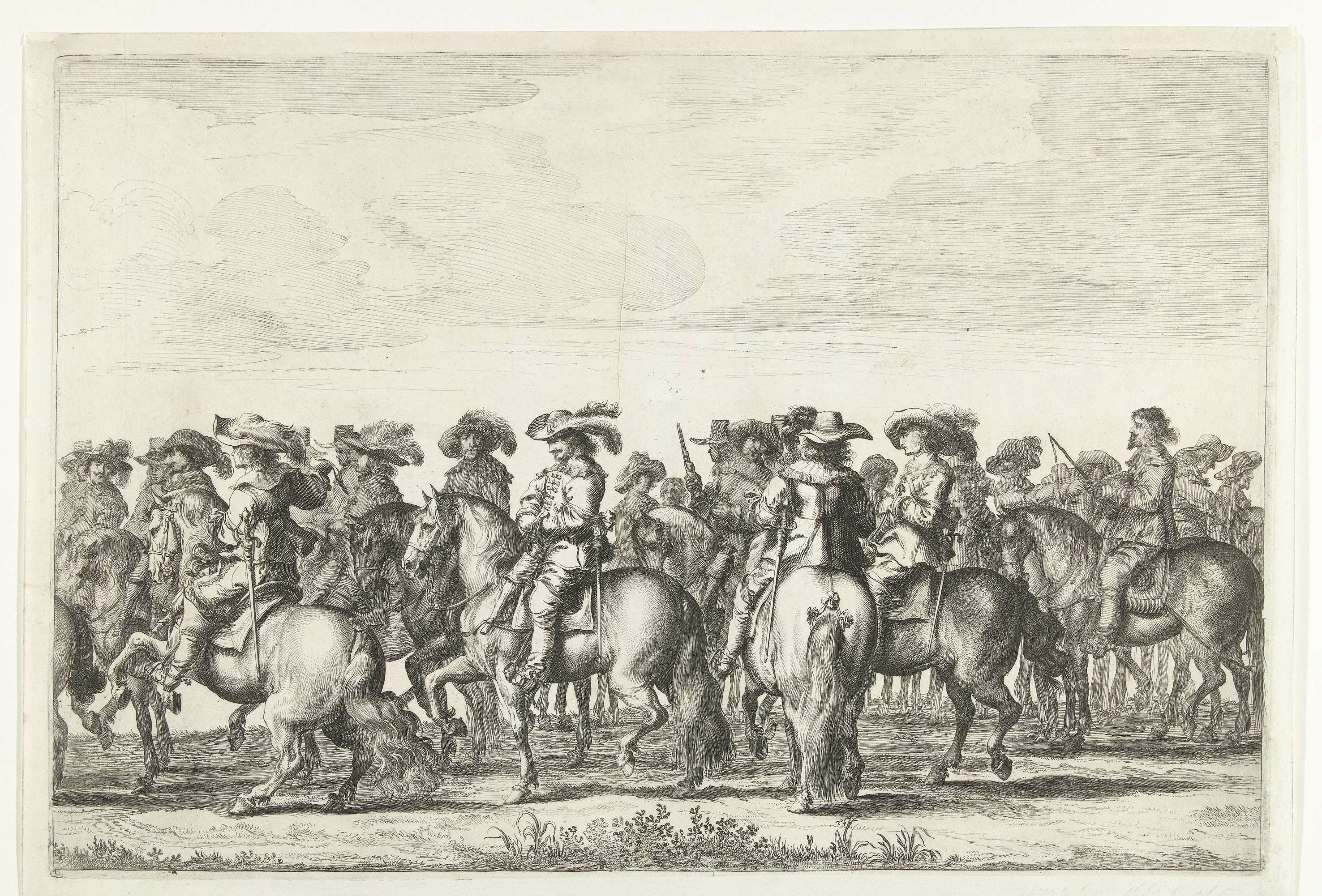 Bezoek van de Maria Henrietta Stuart, prinses van Oranje, vergezeld door Amalia van Solms, de jonge prins Willem III en anderen te Amsterdam, 15 juni 1660. Blad met een deel van de stoet met ruiters. Vijfde plaat in een ongemonteerd ensemble bestaande uit een zeven bladen van de stoet.