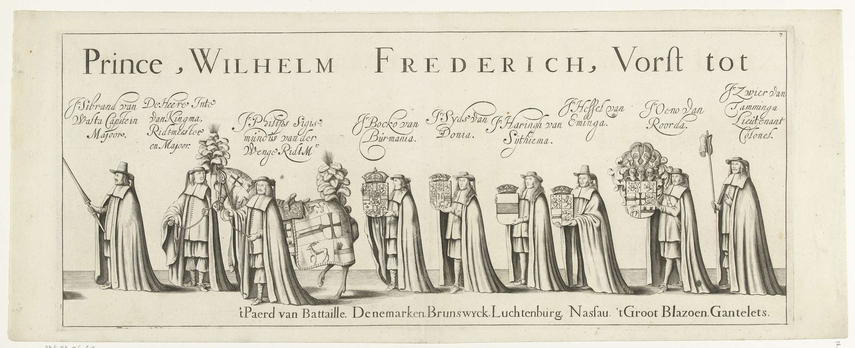 Begrafenisoptocht van Willem Frederik, graaf van Nassau-Dietz, in Leeuwarden op 6 januari 1665. Deel van de begrafenisstoet. Plaat nr. 7 in een ensemble van 25 ongemonteerde genummerde platen en twee tekstbladen die samen een lange fries vormen.