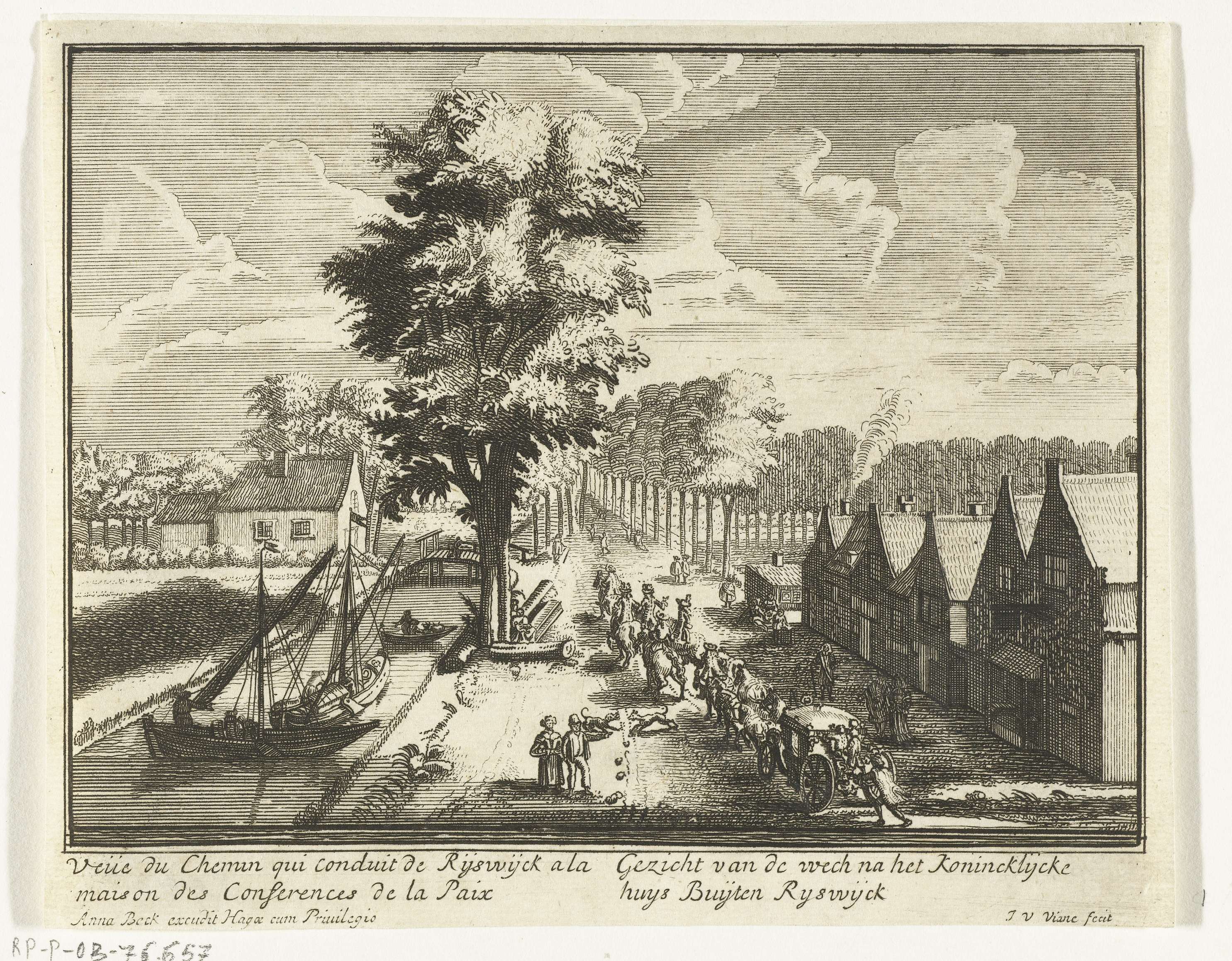 De weg naar het Huis ter Nieuburch in Rijswijk. In het onderschrift de twee titels in het Frans en Nederlands. Onderdeel (prent 1) van de serie van zestien kleinere prenten over het Huis ter Nieuburch in Rijswijk en de daar gehouden vredesonderhandelingen resulterend in de Vrede van Rijswijk gesloten op 20 september 1697.