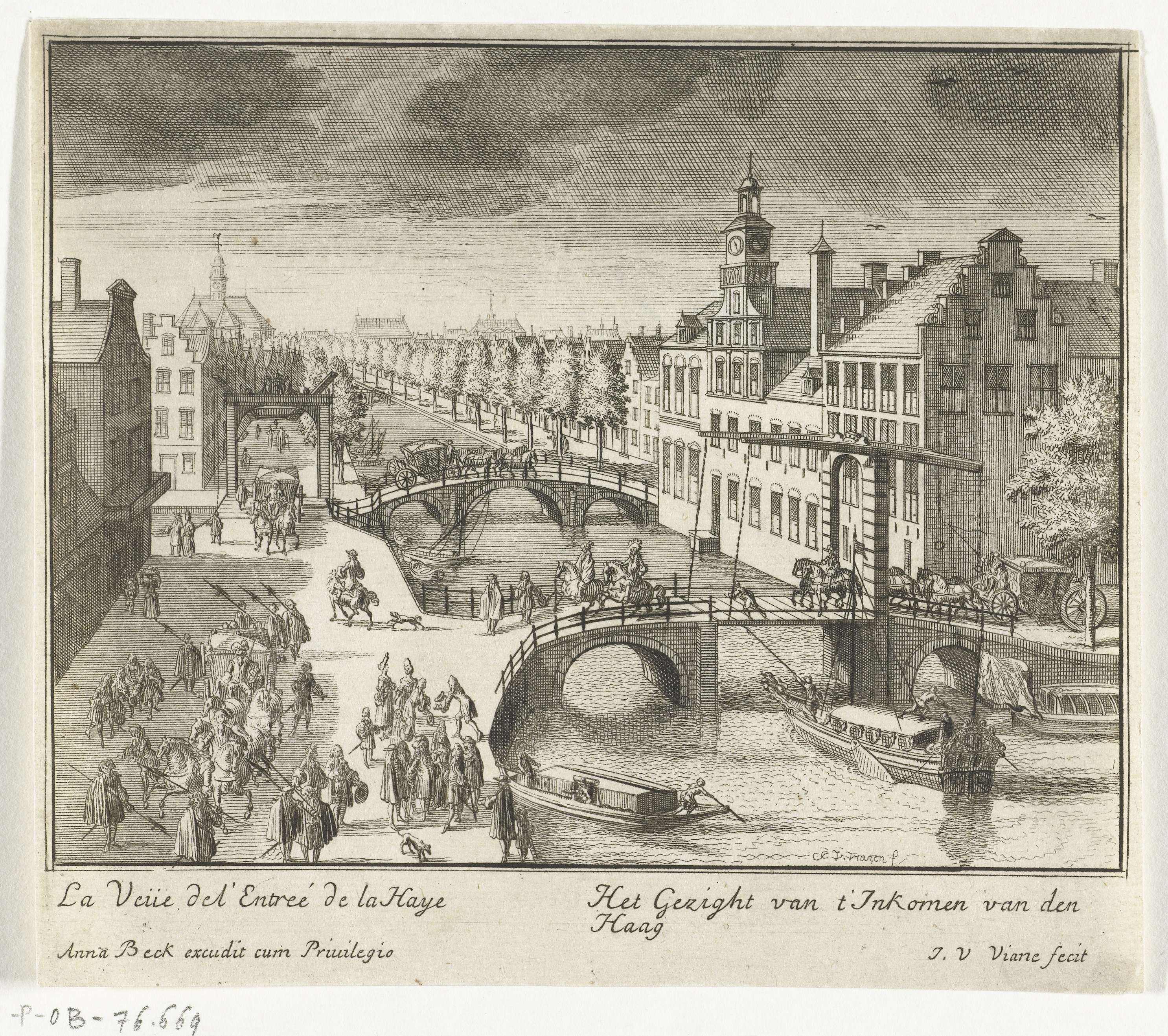 Gezicht bij het binnenkomen van Den Haag. In het onderschrift de twee titels in het Frans en Nederlands. Onderdeel (prent 13) van de serie van zestien kleinere prenten over het Huis ter Nieuburch in Rijswijk en de daar gehouden vredesonderhandelingen resulterend in de Vrede van Rijswijk gesloten op 20 september 1697.