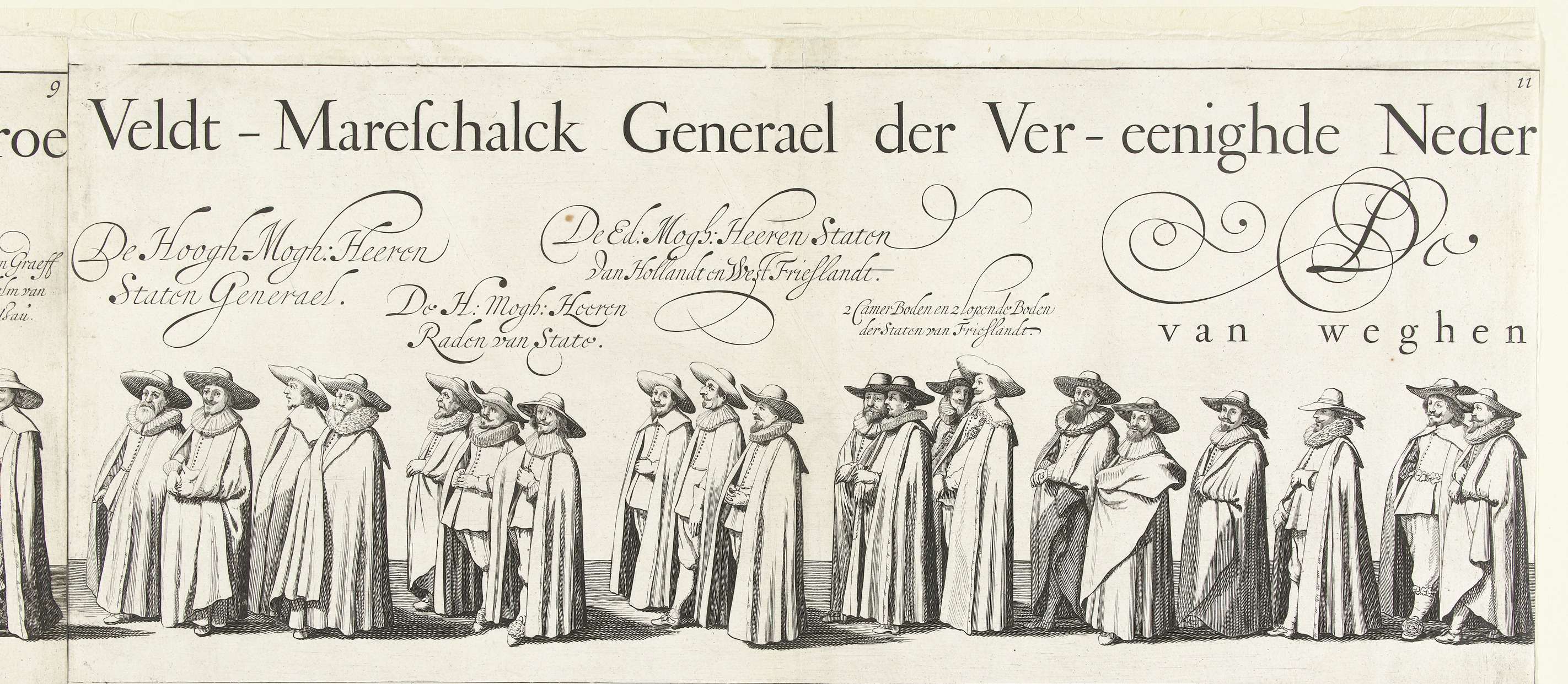 Deel van de begrafenisstoet met leden van de Staten-Generaal. Bovenin de functies van de afgebeelde personen. Plaat nr. 11 in de prentserie van de begrafenis van Ernst Casimir, graaf van Nassau-Dietz te Leeuwarden, 3 januari 1633. De wapens en vaandels zijn ingekleurd. Dit blad samen met bladen 9, 10 en 12 aan elkaar geplakt.