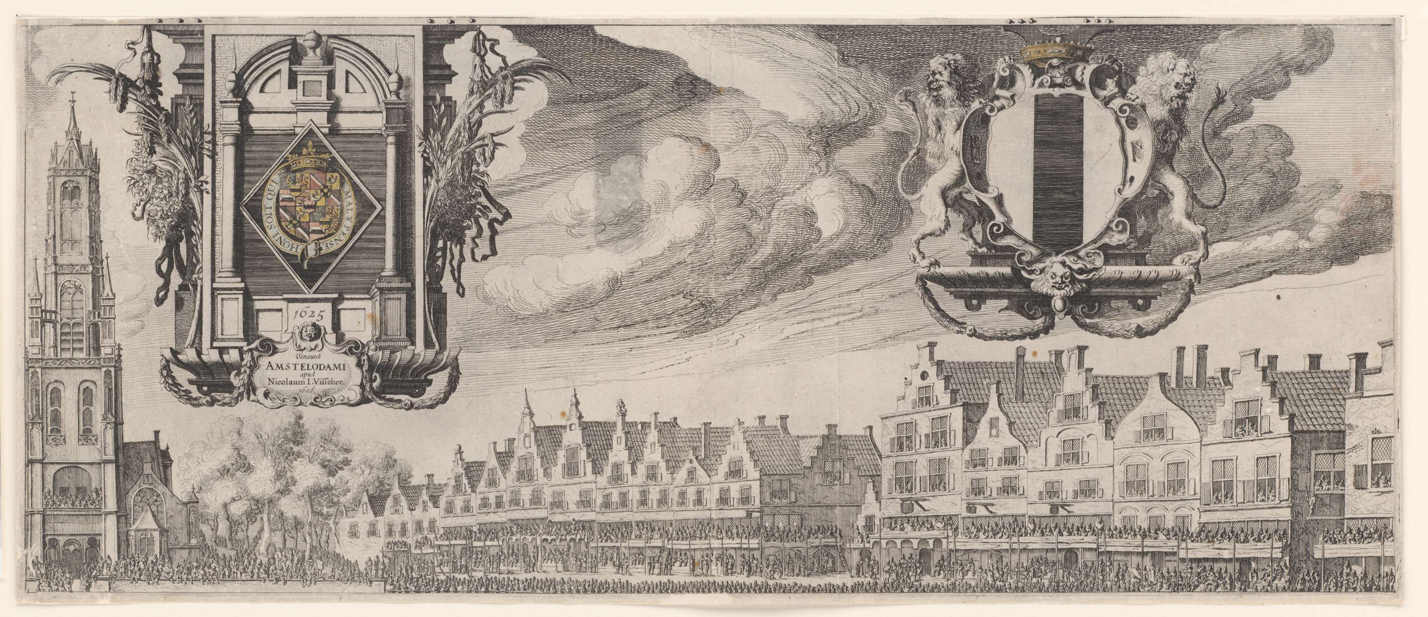 De begrafenisstoet van prins Maurits te Delft op 16 september 1625. Grote voorstelling van de ceremonie, bestaande uit 4 te monteren bladen, een titel en bijbehorende tekstblaadjes (genummerd 1-12). Dit is het blad rechtsboven, met de Nieuwe Kerk en andere gebouwen aan de Grote Markt te Delft, in de lucht het wapen van Maurits in ...