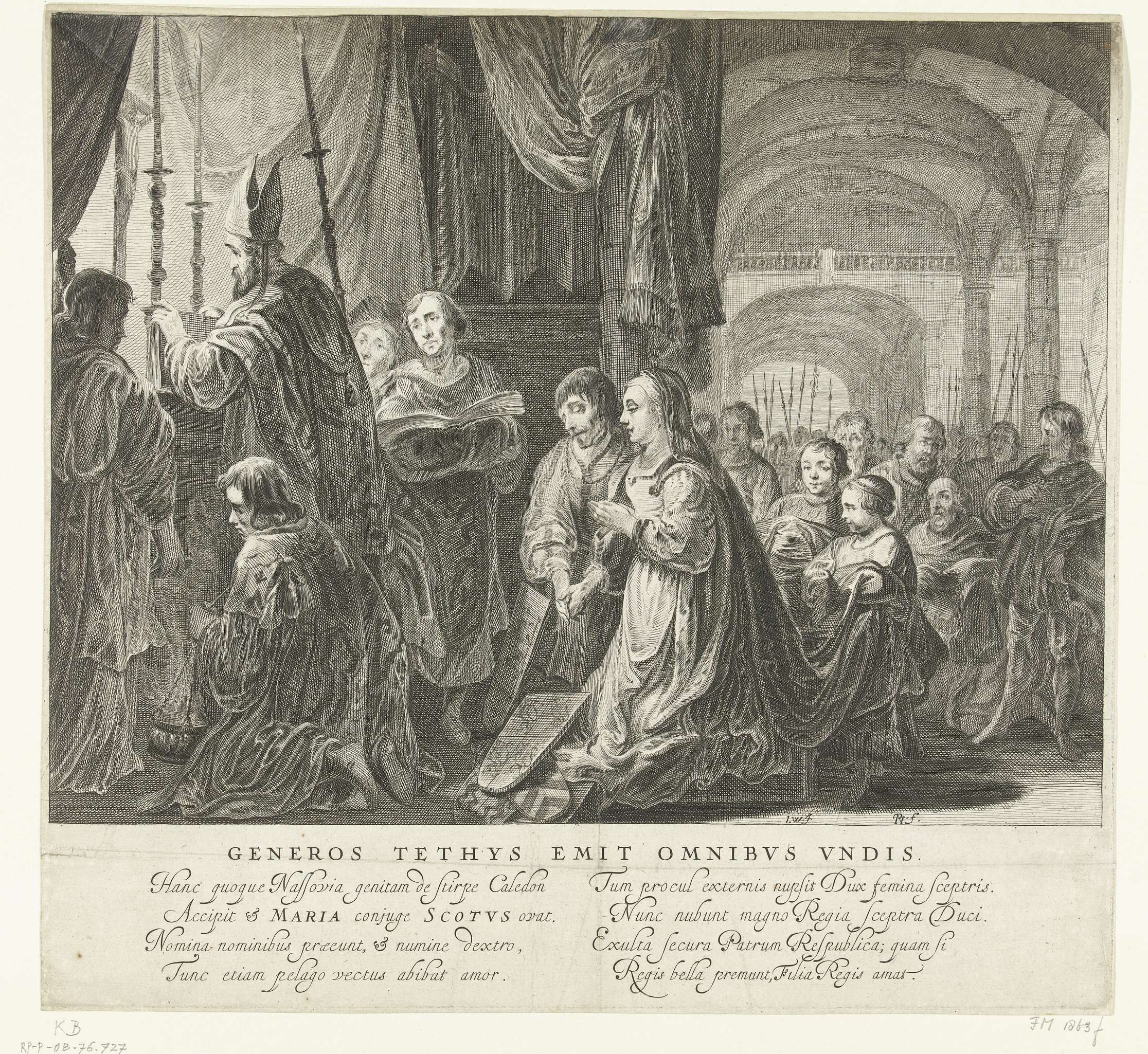 Allegorisch tableau vivant met het huwelijk van koning Jacobus II van Schotland met Maria van Gelre-Egmond in 1449. Vertoning in de theaterpoort opgericht op de Varkenssluis voor de Doelenstraat bij het bezoek van Engelse koningin Henrietta Maria aan Amsterdam, 20-22 mei 1642. In het onderschrift de titel en 2 keer 4 regels in het Latijn. ...