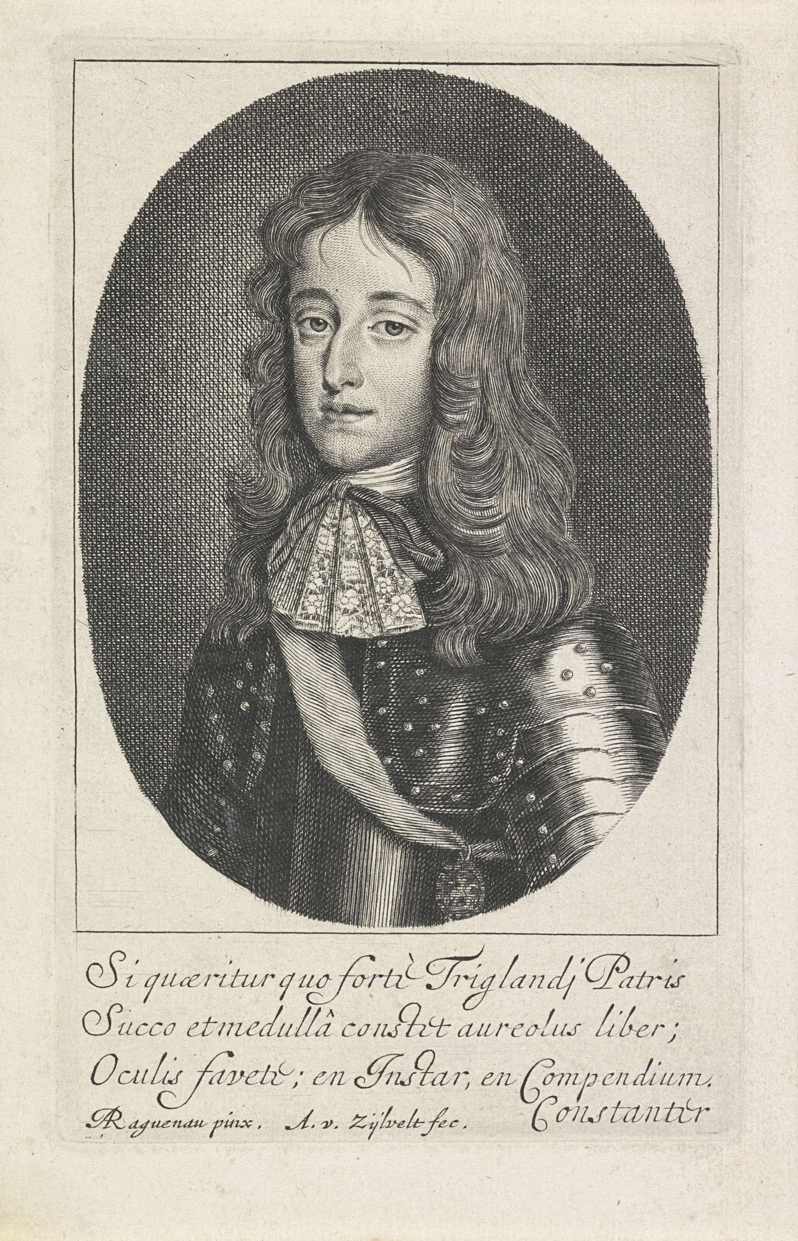 Portret van Willem III in een ovaal. In de ondermarge vier regels Latijnse tekst.