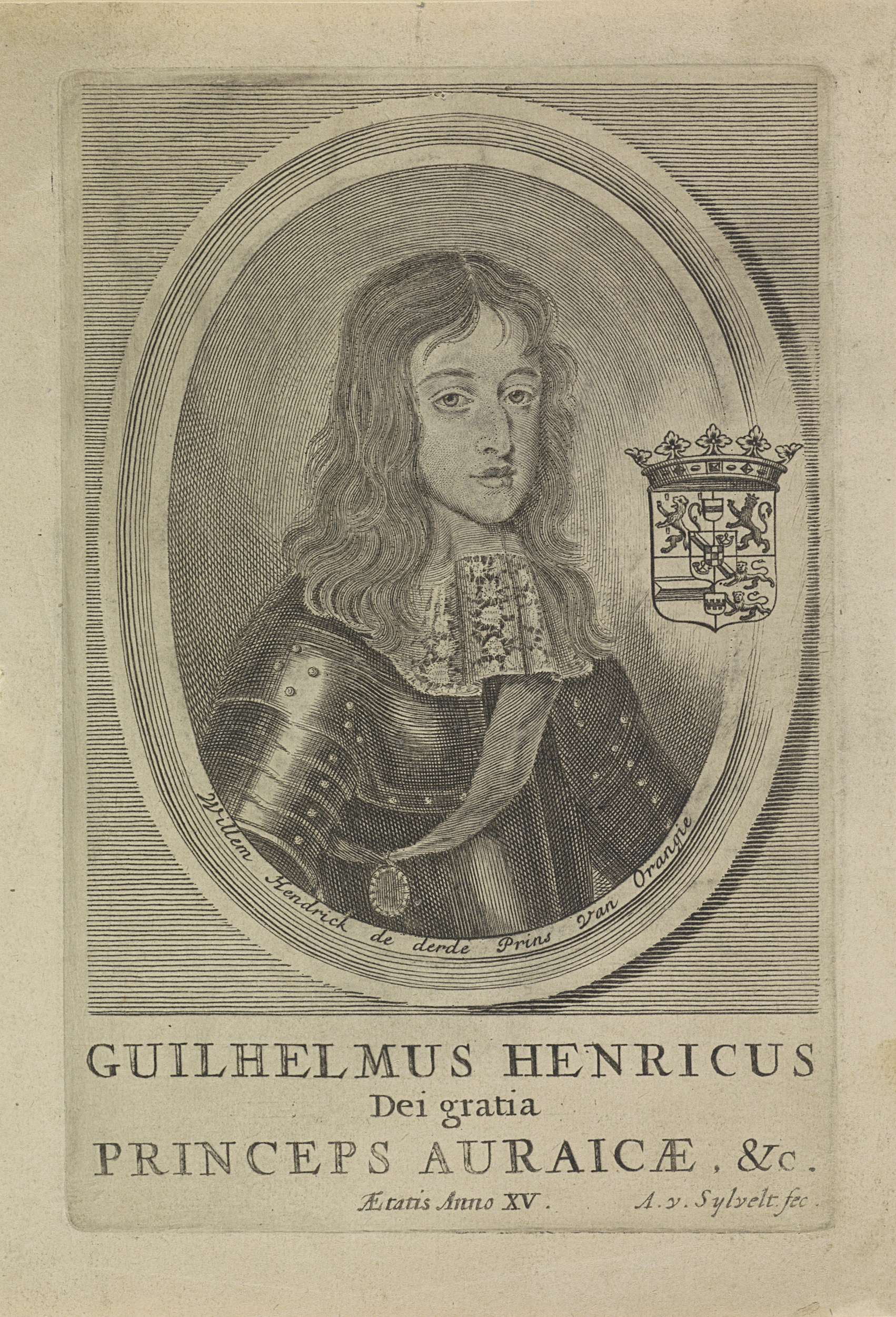 Portret van Willem III in een ovaal met randschrift. Rechts zijn wapen met een kroon. In de ondermarge zijn naam, titels en leeftijd.