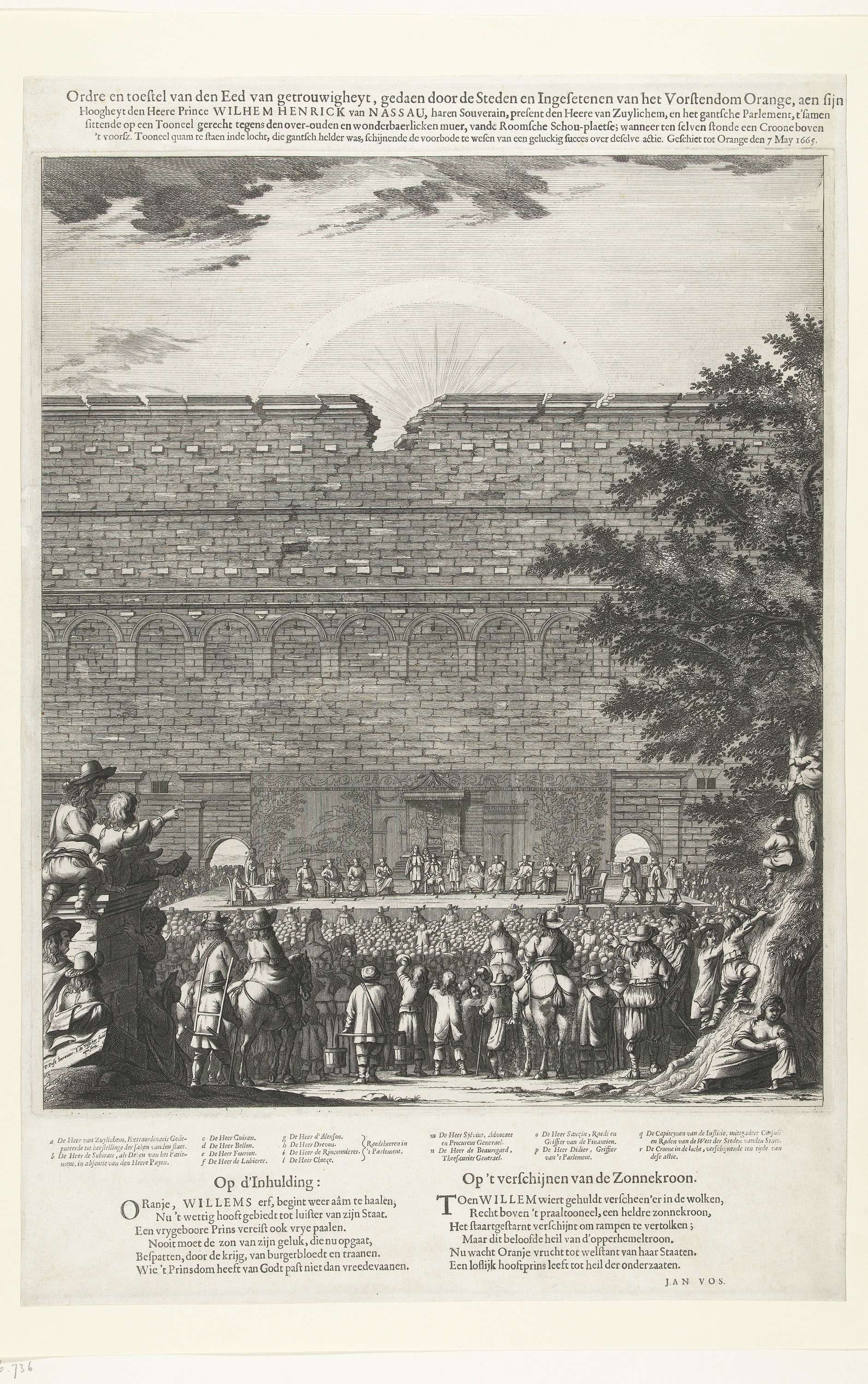 Eed van trouw afgelegd door de steden en de ingezetenen van het vorstendom van Orange aan prins Willem III, 7 mei 1665. Ceremonie met de afgevaardigden van de prins en van Orange zittend op een toneel opgesteld voor het Romeinse theater te Orange, voor het podium een grote menigte toeschouwers. Boven de muur van het ...