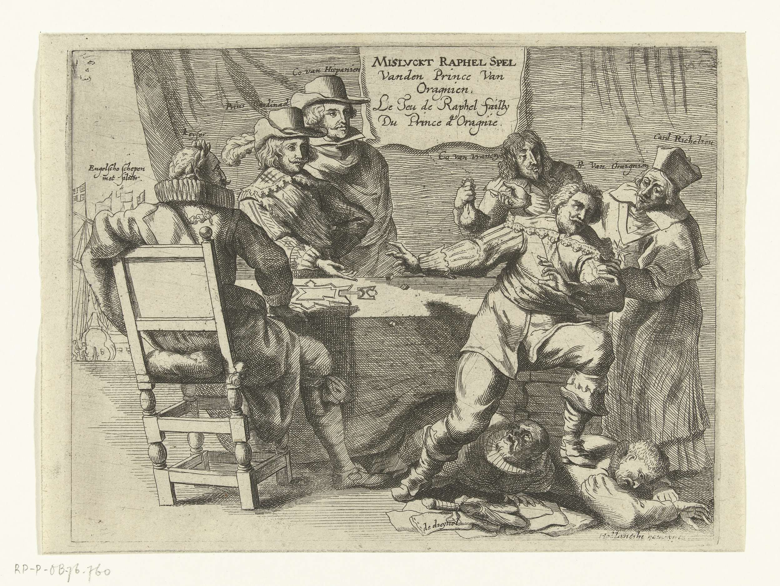 Spotprent op de strijd om Schenckenschans in de jaren 1635-1636. Frederik Hendrik en de kardinaal infant Ferdinand dobbelen aan een tafel om het fort. De stadhouder wil vluchten maar wordt tegengehouden door kardinaal Richelieu en de koning van Frankrijk die hem een zak geld aanbiedt. Aan de zijde van de gouverneur Ferdinand zijn ook aanwezig ...