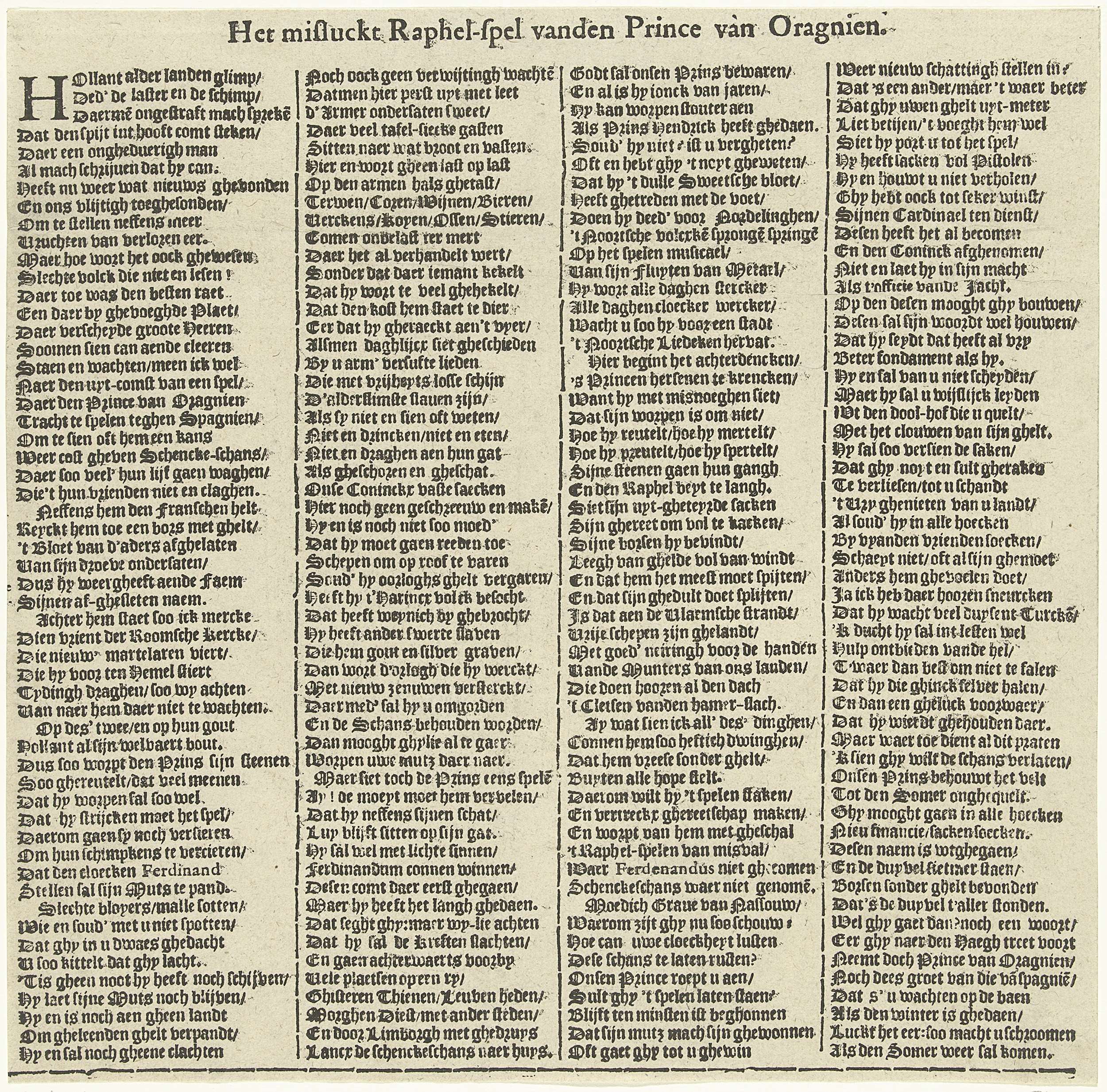 Het mislukte spel om Schenckenschans. Tekstblad bij de spotprent op de strijd om Schenckenschans in de jaren 1635-1636. Blad met 4 kolommen tekst in het Nederlands. Antwoord van Spaanse zijde op de prent beschreven onder FMH 1747.