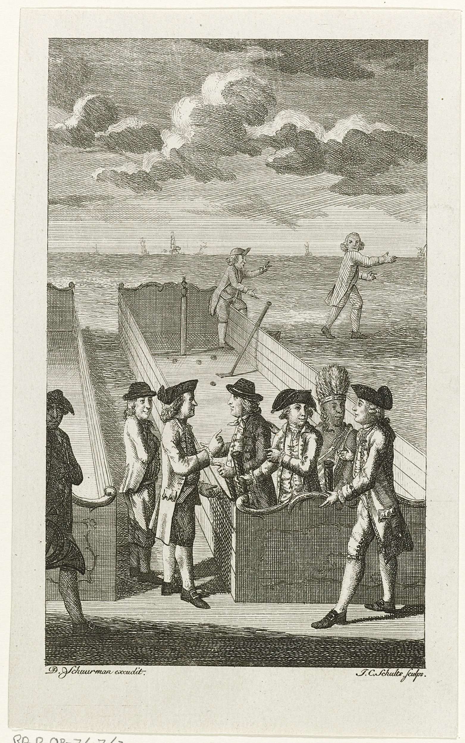 Een Nederlander, een Fransman en een oorspronkelijke Noord- Amerikaan spelen kolf op een afgesloten kolfbaan. Anderen die willen meespelen worden afgeweerd, op de achtergrond verjaagt een Hollander een Engelsman.