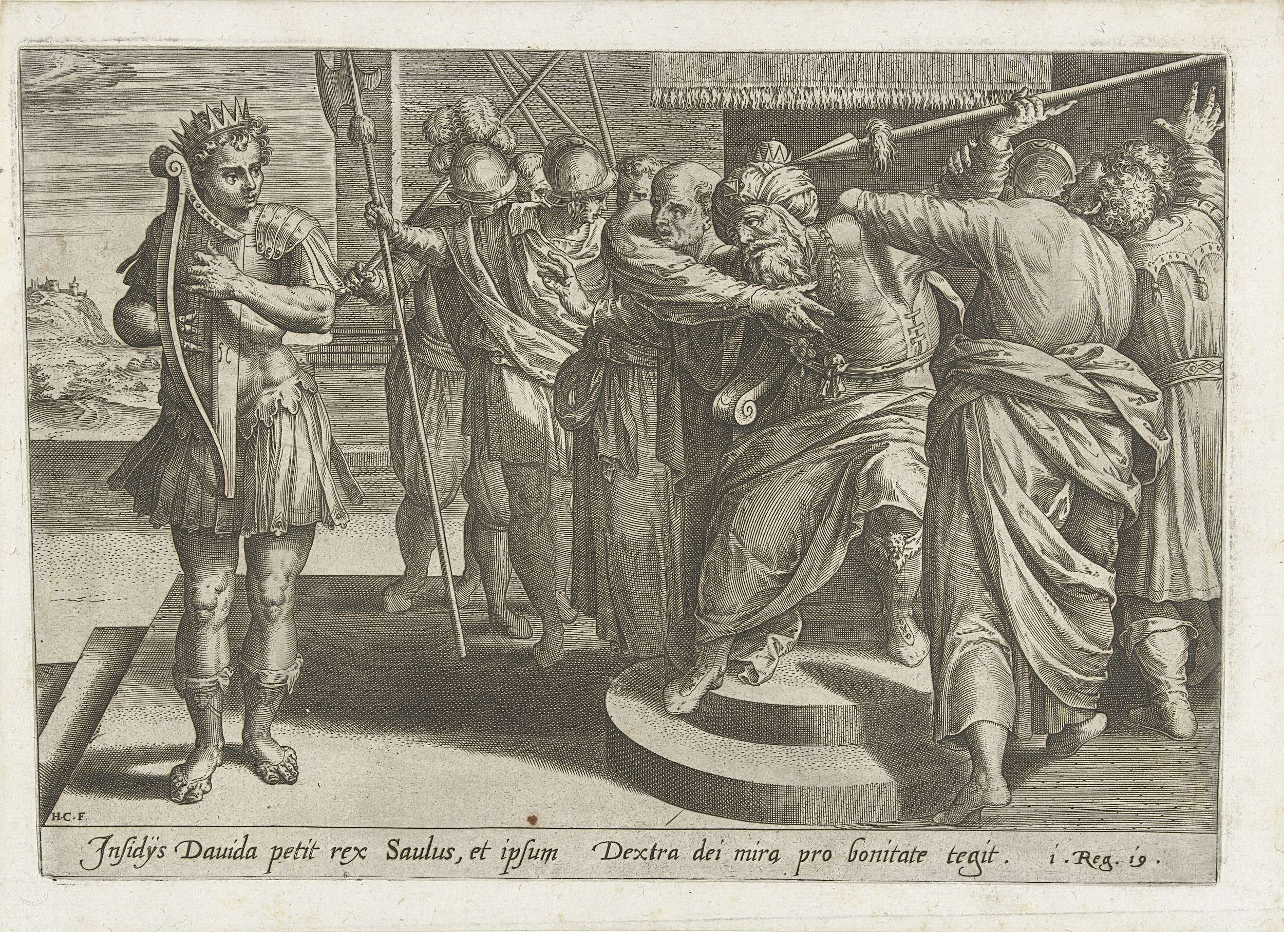 De jonge David speelt op zijn harp. Hij staat voor de troon van koning Saul. Saul ontsteekt in razernij en probeert met een speer de jongen te doden. Hij wordt tegengehouden door enkele dienaren en soldaten. De prent heeft een Latijns onderschrift en maakt deel uit van een prentserie over het verhaal van David en ...