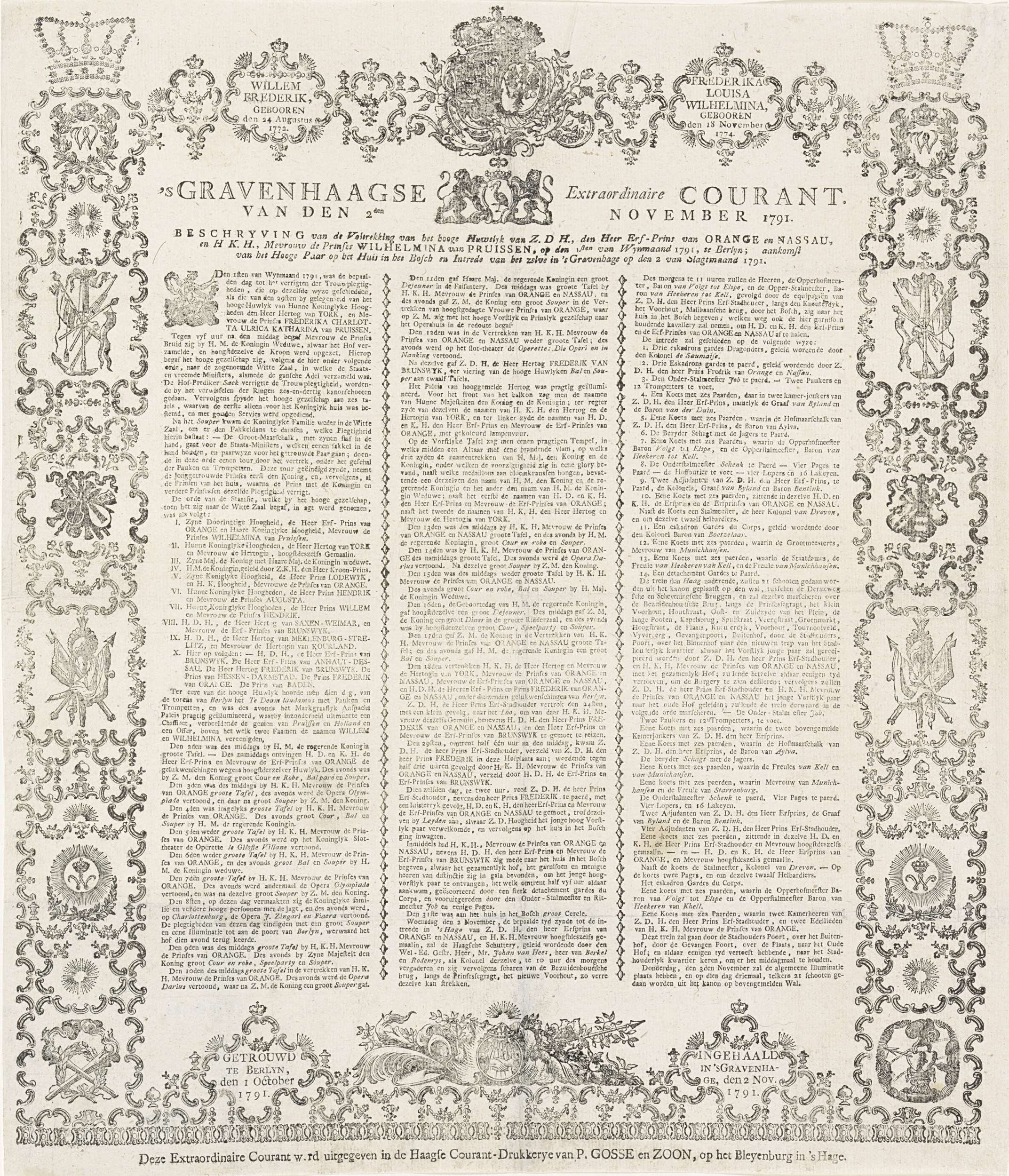 Aflevering van de 's Gravenhaagse Extraordinaire Courant van 2 November 1791, naar aanleiding van de inhaling te Den Haag op 2 november van het pasgetrouwde paar van prins Willem Frederik en prinses Wilhelmina van Pruisen, getrouwd op 1 oktober 1791 te Berlijn. Tekst in drie kolommen binnen een decoratieve omijlsting van fileten met vignetten en ...
