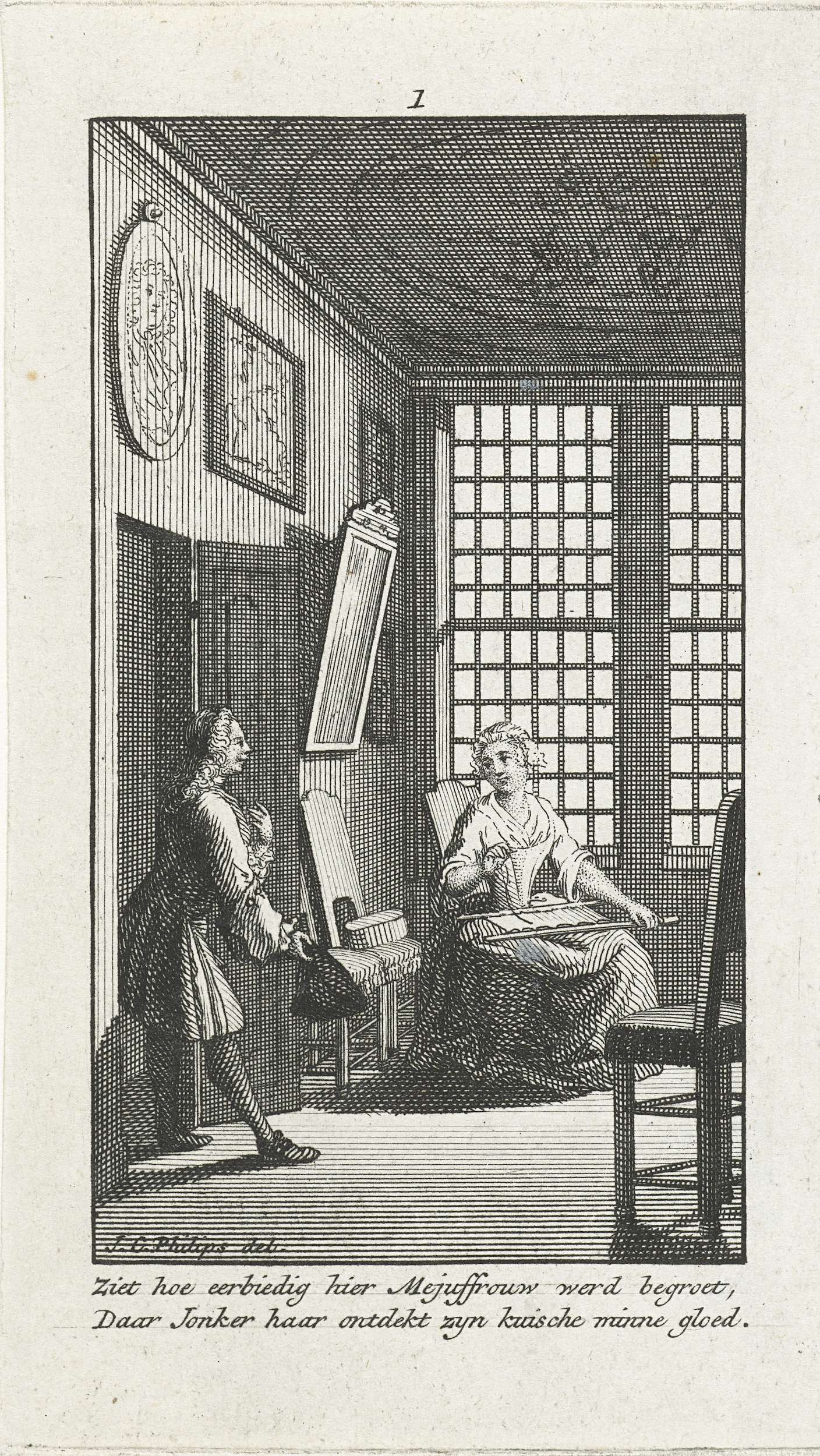 De man begroet de vrouw. Interieur met vrouw zittend bij raam en man staand bij deur. Prent nr. 1 in een serie van twaalf prentjes met tweeregelige versjes over de Hollandse gewoontes bij het huwelijk ca. 1750.