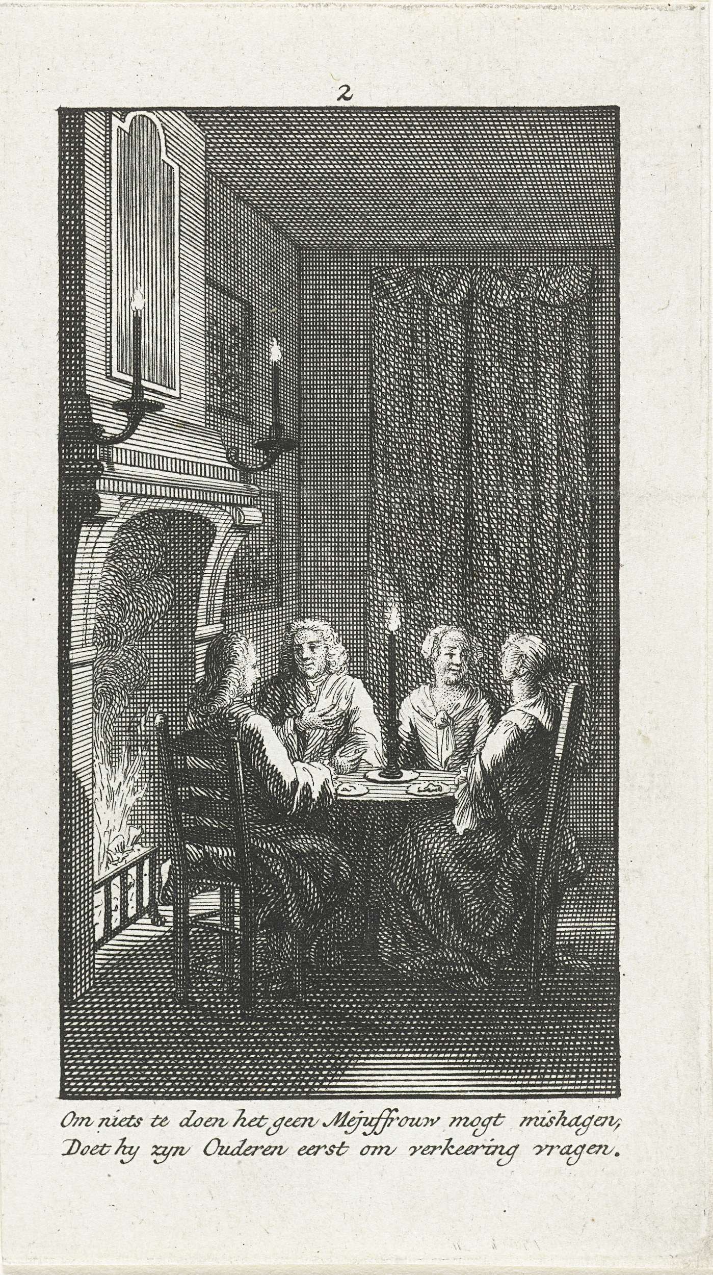 De man ontmoet de ouders van zijn aanstaande. Interieur met twee mannen en twee vrouwen rond tafel gezeten. Prent nr. 2 in een serie van twaalf prentjes met tweeregelige versjes over de Hollandse gewoontes bij het huwelijk ca. 1750.