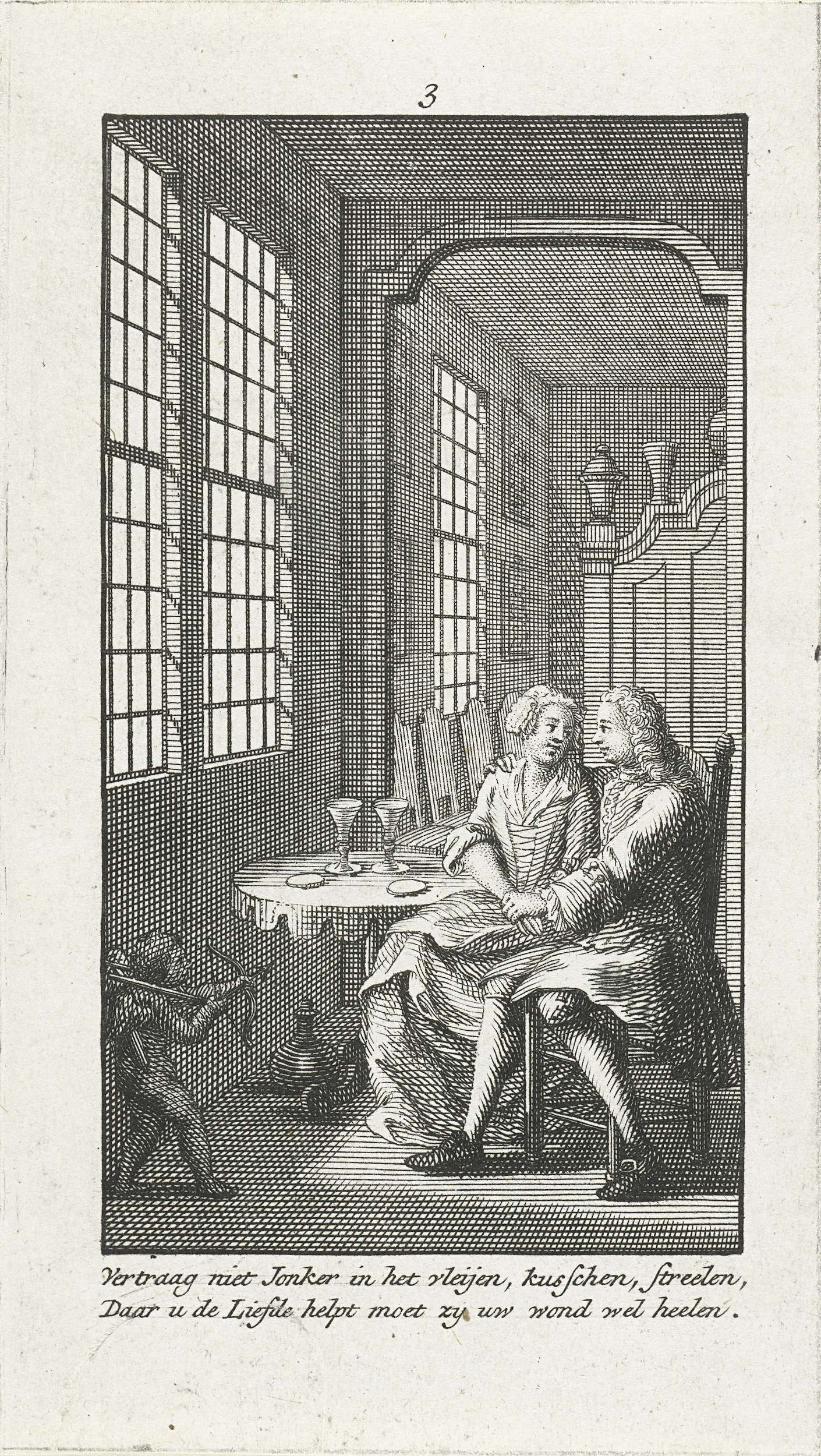 Vrijage. Interieur met rechts minnend paar en links een cupido met pijl en boog. Prent nr. 3 in een serie van twaalf prentjes met tweeregelige versjes over de Hollandse gewoontes bij het huwelijk ca. 1750.