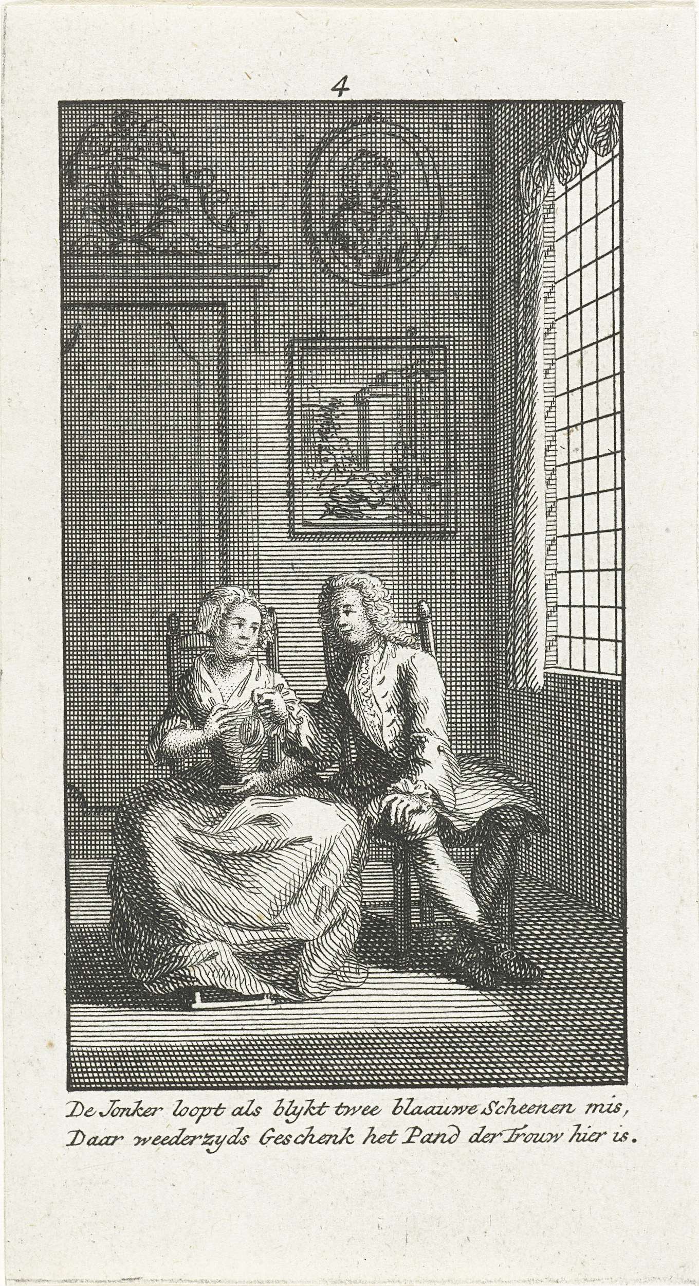 Interieur met man en vrouw naast elkaar op stoel, waarbij hij een geschenk op haar schoot legt. Prent nr. 4 in een serie van twaalf prentjes met tweeregelige versjes over de Hollandse gewoontes bij het huwelijk ca. 1750.